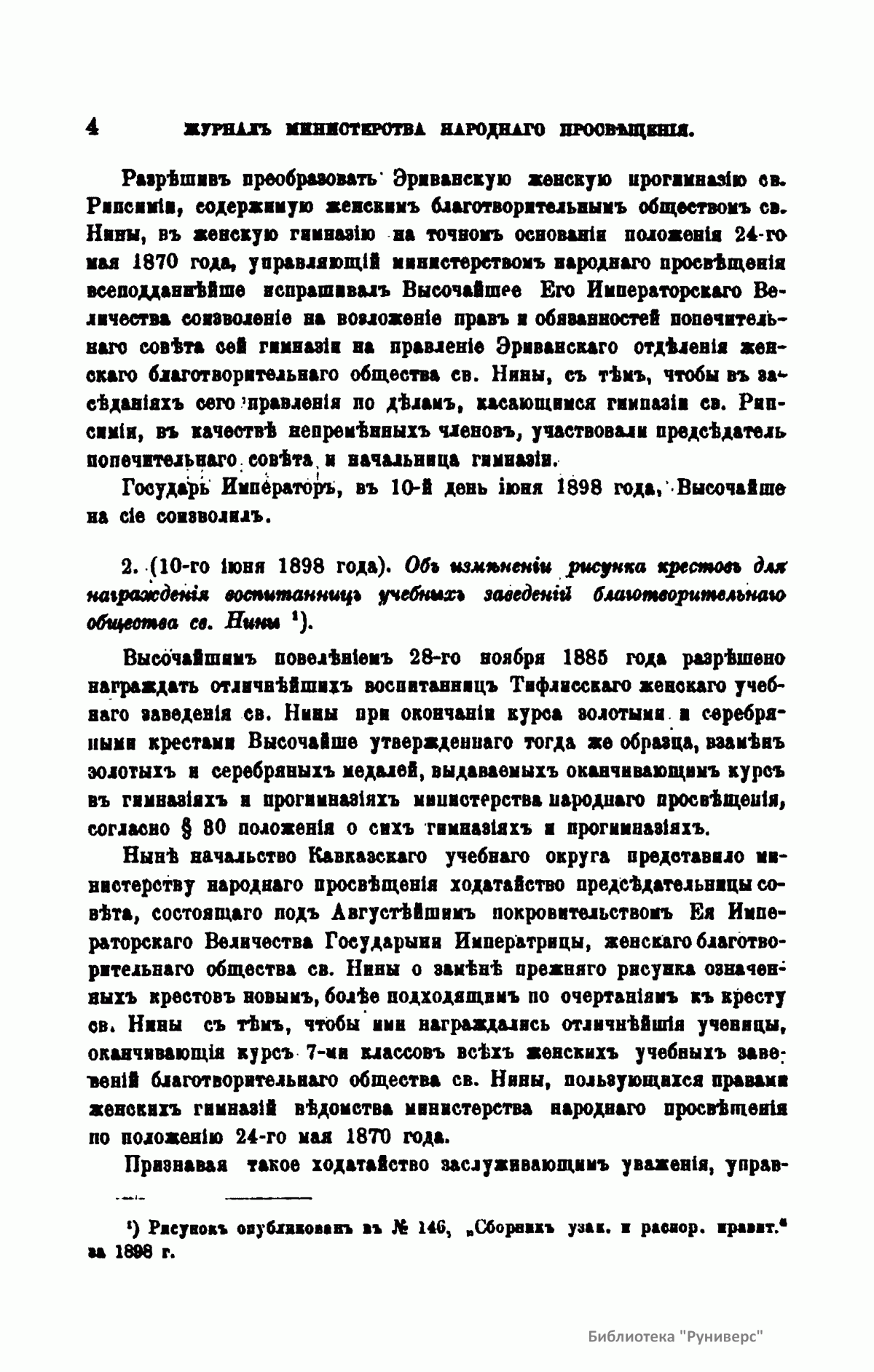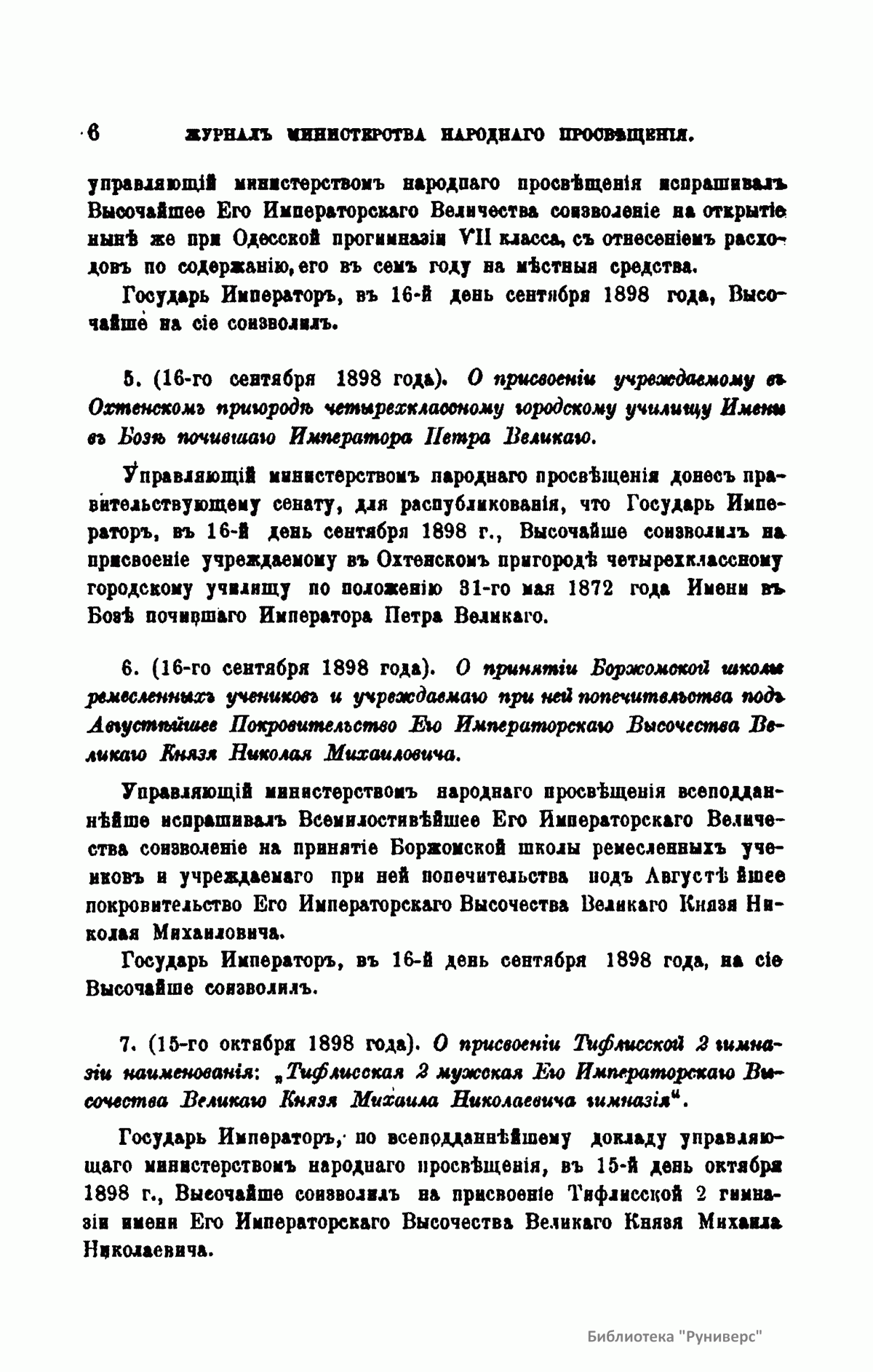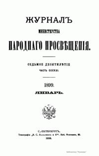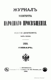 Журнал Министерства народного просвещения выходил с 1834-го по 1917 год. Официальный периодический журнал об успехах просвещения в России. Издатели журнала уверены в том, что «если для каждого человека необходим выход из грубой тьмы невежества и беспрерывное дальнейшее движение к свету, то для народов необходимо попечительное участие правительства в образовании. Только правительство имеет все средства знать и высоту успехов всемирного образования, и настоящие нужды Отечества».