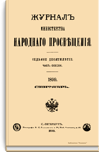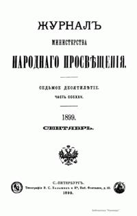 Журнал Министерства народного просвещения выходил с 1834-го по 1917 год. Официальный периодический журнал об успехах просвещения в России. Издатели журнала уверены в том, что «если для каждого человека необходим выход из грубой тьмы невежества и беспрерывное дальнейшее движение к свету, то для народов необходимо попечительное участие правительства в образовании. Только правительство имеет все средства знать и высоту успехов всемирного образования, и настоящие нужды Отечества».