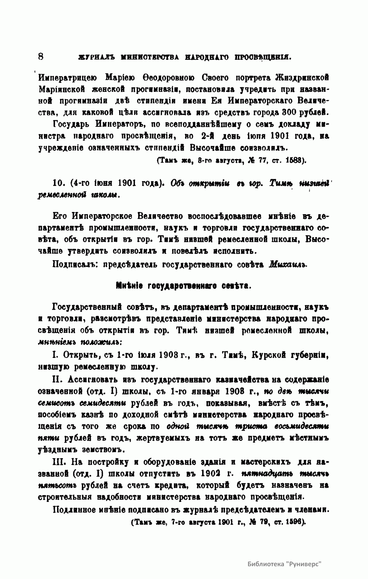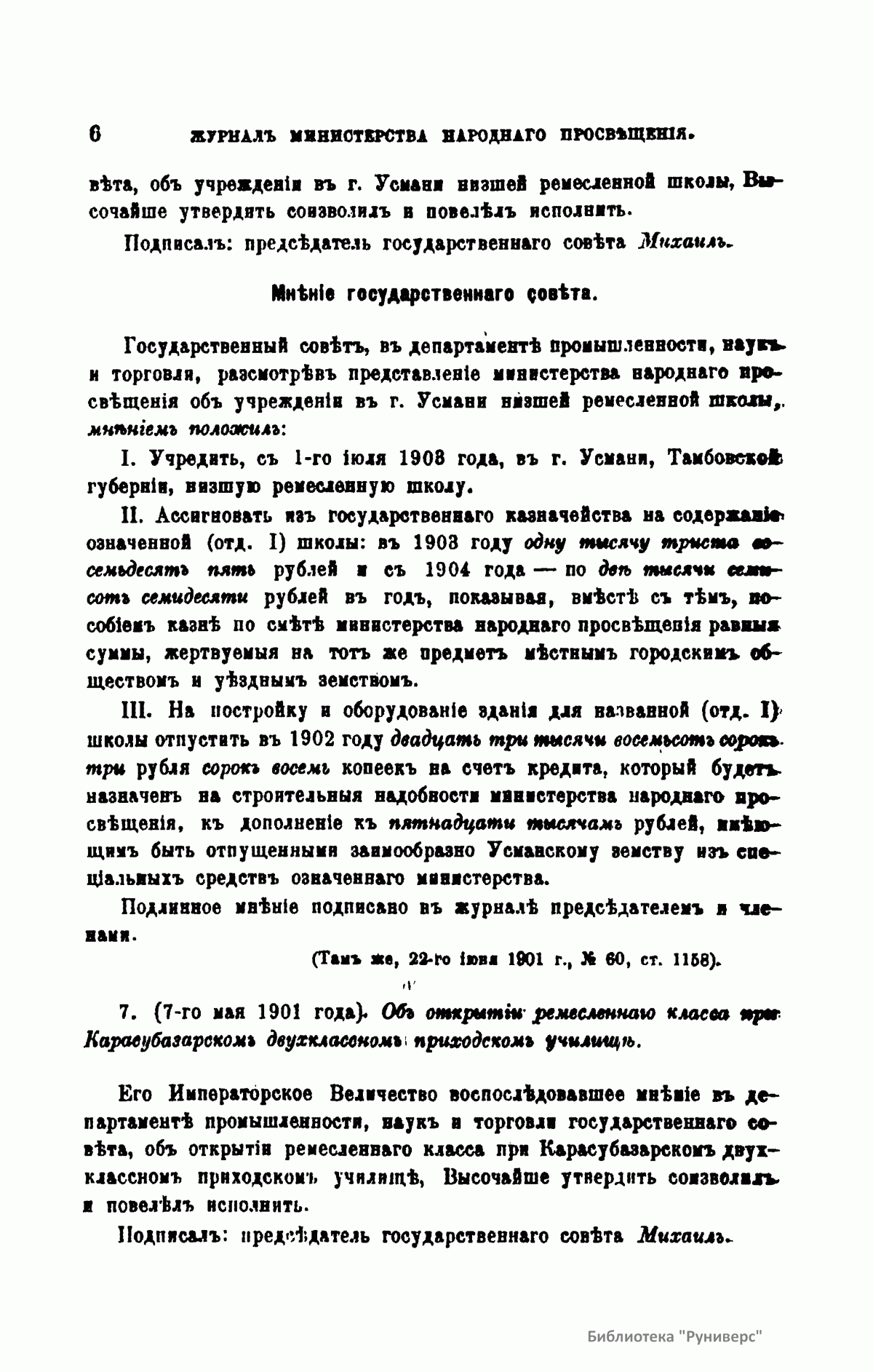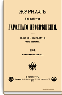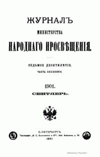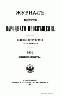 Журнал Министерства народного просвещения выходил с 1834-го по 1917 год. Официальный периодический журнал об успехах просвещения в России. Издатели журнала уверены в том, что «если для каждого человека необходим выход из грубой тьмы невежества и беспрерывное дальнейшее движение к свету, то для народов необходимо попечительное участие правительства в образовании. Только правительство имеет все средства знать и высоту успехов всемирного образования, и настоящие нужды Отечества».