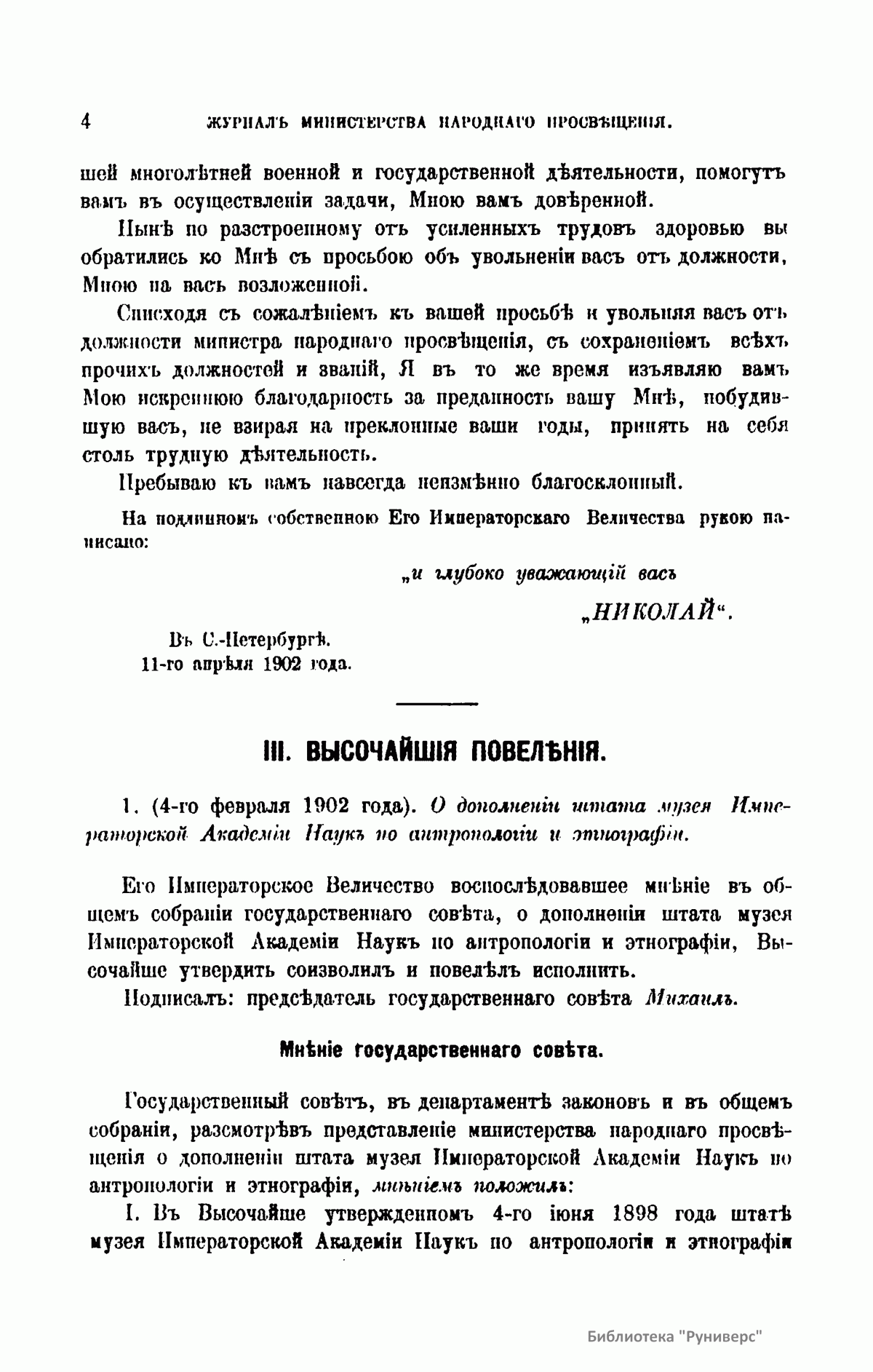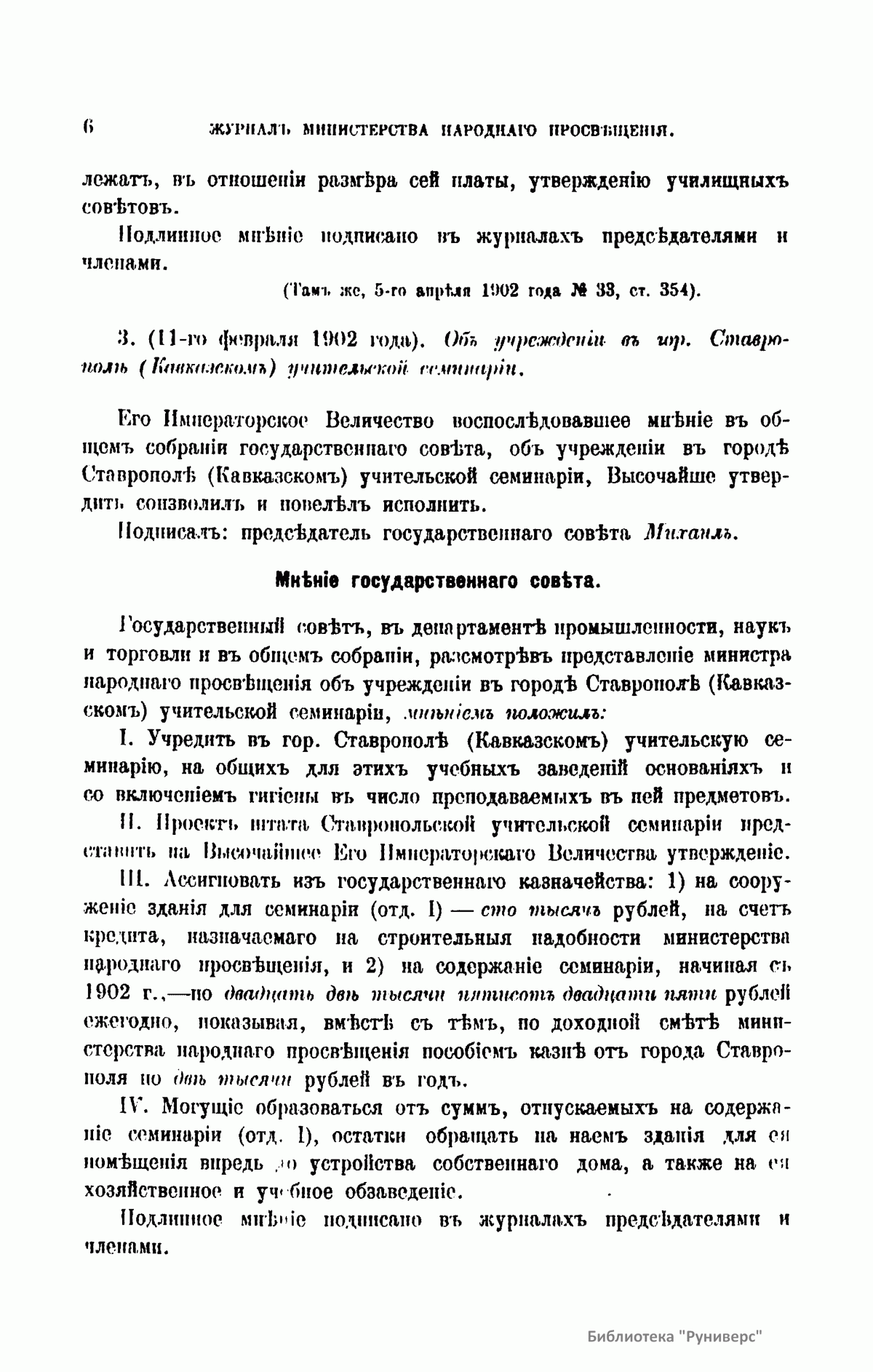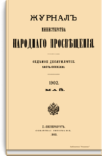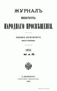 Журнал Министерства народного просвещения выходил с 1834-го по 1917 год. Официальный периодический журнал об успехах просвещения в России. Издатели журнала уверены в том, что «если для каждого человека необходим выход из грубой тьмы невежества и беспрерывное дальнейшее движение к свету, то для народов необходимо попечительное участие правительства в образовании. Только правительство имеет все средства знать и высоту успехов всемирного образования, и настоящие нужды Отечества».