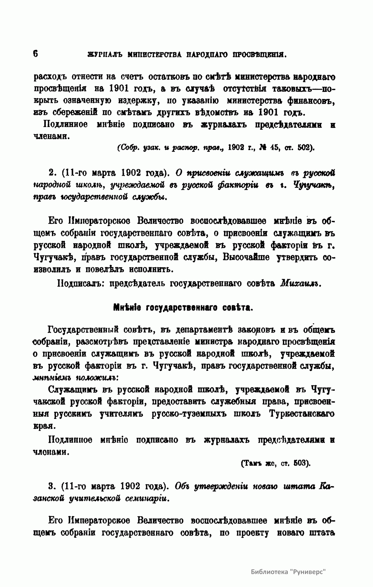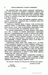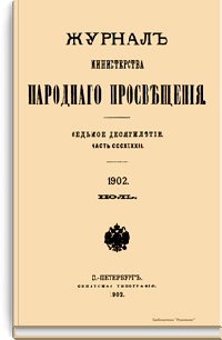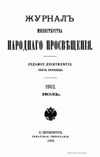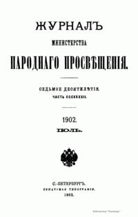 Журнал Министерства народного просвещения выходил с 1834-го по 1917 год. Официальный периодический журнал об успехах просвещения в России. Издатели журнала уверены в том, что «если для каждого человека необходим выход из грубой тьмы невежества и беспрерывное дальнейшее движение к свету, то для народов необходимо попечительное участие правительства в образовании. Только правительство имеет все средства знать и высоту успехов всемирного образования, и настоящие нужды Отечества».