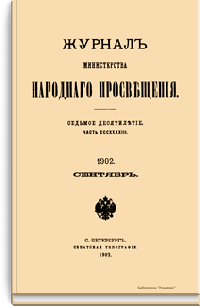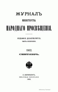 Журнал Министерства народного просвещения выходил с 1834-го по 1917 год. Официальный периодический журнал об успехах просвещения в России. Издатели журнала уверены в том, что «если для каждого человека необходим выход из грубой тьмы невежества и беспрерывное дальнейшее движение к свету, то для народов необходимо попечительное участие правительства в образовании. Только правительство имеет все средства знать и высоту успехов всемирного образования, и настоящие нужды Отечества».
