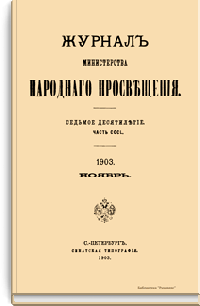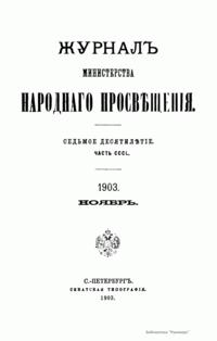 Журнал Министерства народного просвещения выходил с 1834-го по 1917 год. Официальный периодический журнал об успехах просвещения в России. Издатели журнала уверены в том, что «если для каждого человека необходим выход из грубой тьмы невежества и беспрерывное дальнейшее движение к свету, то для народов необходимо попечительное участие правительства в образовании. Только правительство имеет все средства знать и высоту успехов всемирного образования, и настоящие нужды Отечества».
