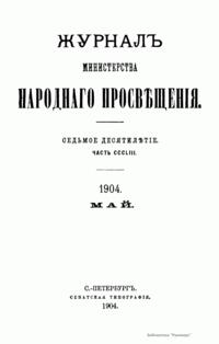 Журнал Министерства народного просвещения выходил с 1834-го по 1917 год. Официальный периодический журнал об успехах просвещения в России. Издатели журнала уверены в том, что «если для каждого человека необходим выход из грубой тьмы невежества и беспрерывное дальнейшее движение к свету, то для народов необходимо попечительное участие правительства в образовании. Только правительство имеет все средства знать и высоту успехов всемирного образования, и настоящие нужды Отечества».