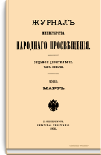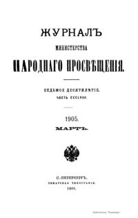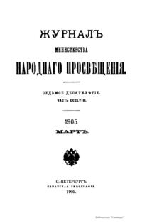 Журнал Министерства народного просвещения выходил с 1834-го по 1917 год. Официальный периодический журнал об успехах просвещения в России. Издатели журнала уверены в том, что «если для каждого человека необходим выход из грубой тьмы невежества и беспрерывное дальнейшее движение к свету, то для народов необходимо попечительное участие правительства в образовании. Только правительство имеет все средства знать и высоту успехов всемирного образования, и настоящие нужды Отечества».