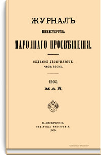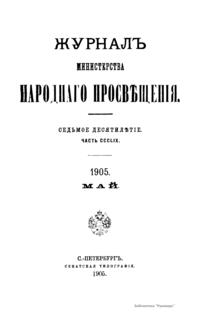 Журнал Министерства народного просвещения выходил с 1834-го по 1917 год. Официальный периодический журнал об успехах просвещения в России. Издатели журнала уверены в том, что «если для каждого человека необходим выход из грубой тьмы невежества и беспрерывное дальнейшее движение к свету, то для народов необходимо попечительное участие правительства в образовании. Только правительство имеет все средства знать и высоту успехов всемирного образования, и настоящие нужды Отечества».