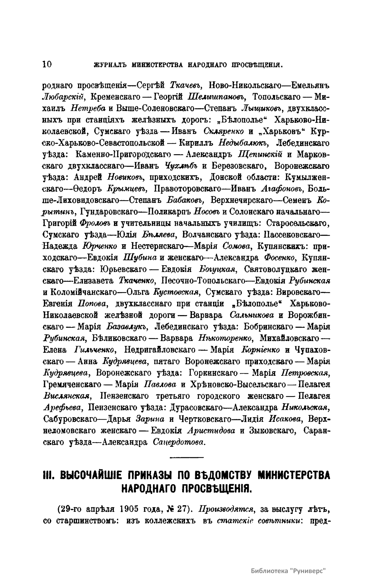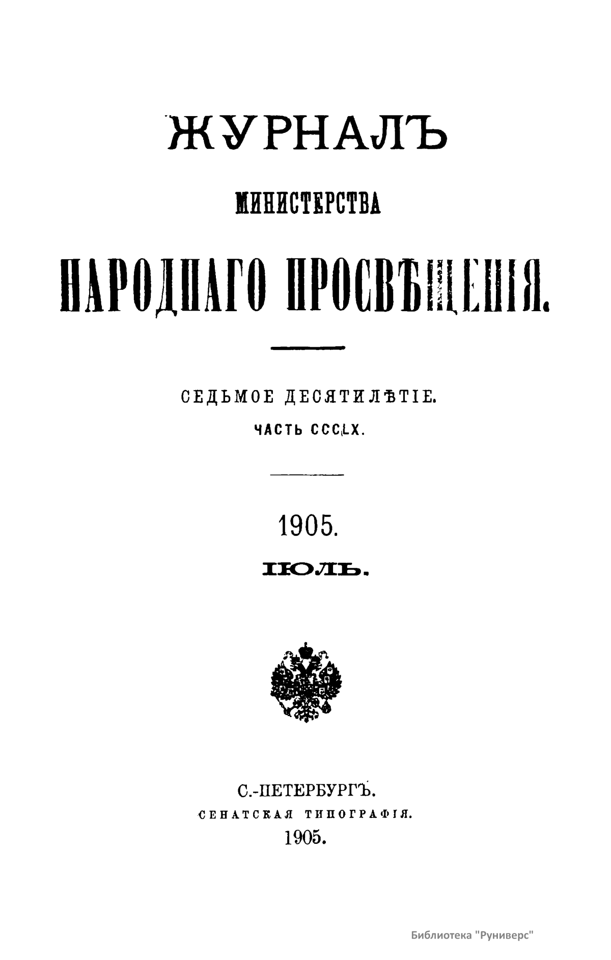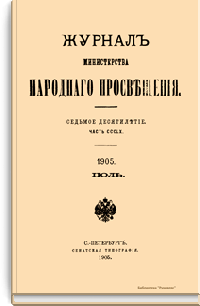 Журнал Министерства народного просвещения выходил с 1834-го по 1917 год. Официальный периодический журнал об успехах просвещения в России. Издатели журнала уверены в том, что «если для каждого человека необходим выход из грубой тьмы невежества и беспрерывное дальнейшее движение к свету, то для народов необходимо попечительное участие правительства в образовании. Только правительство имеет все средства знать и высоту успехов всемирного образования, и настоящие нужды Отечества».