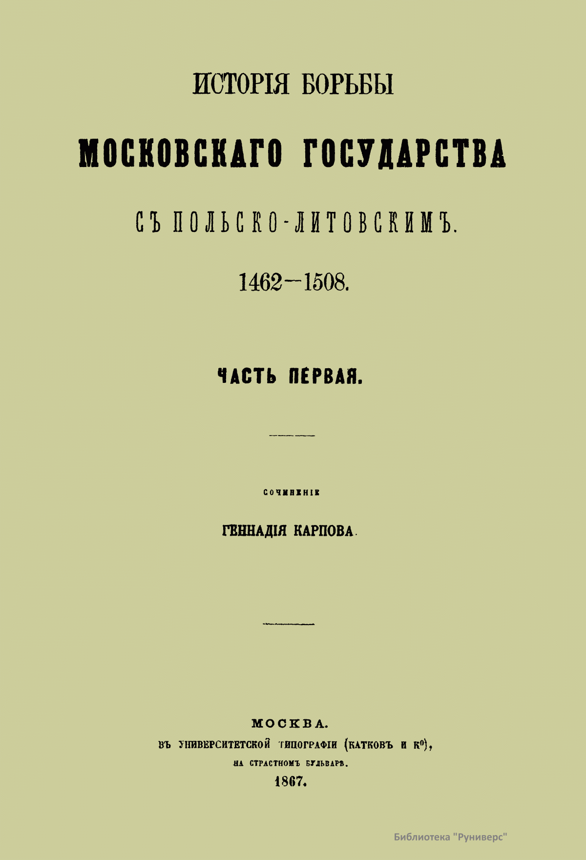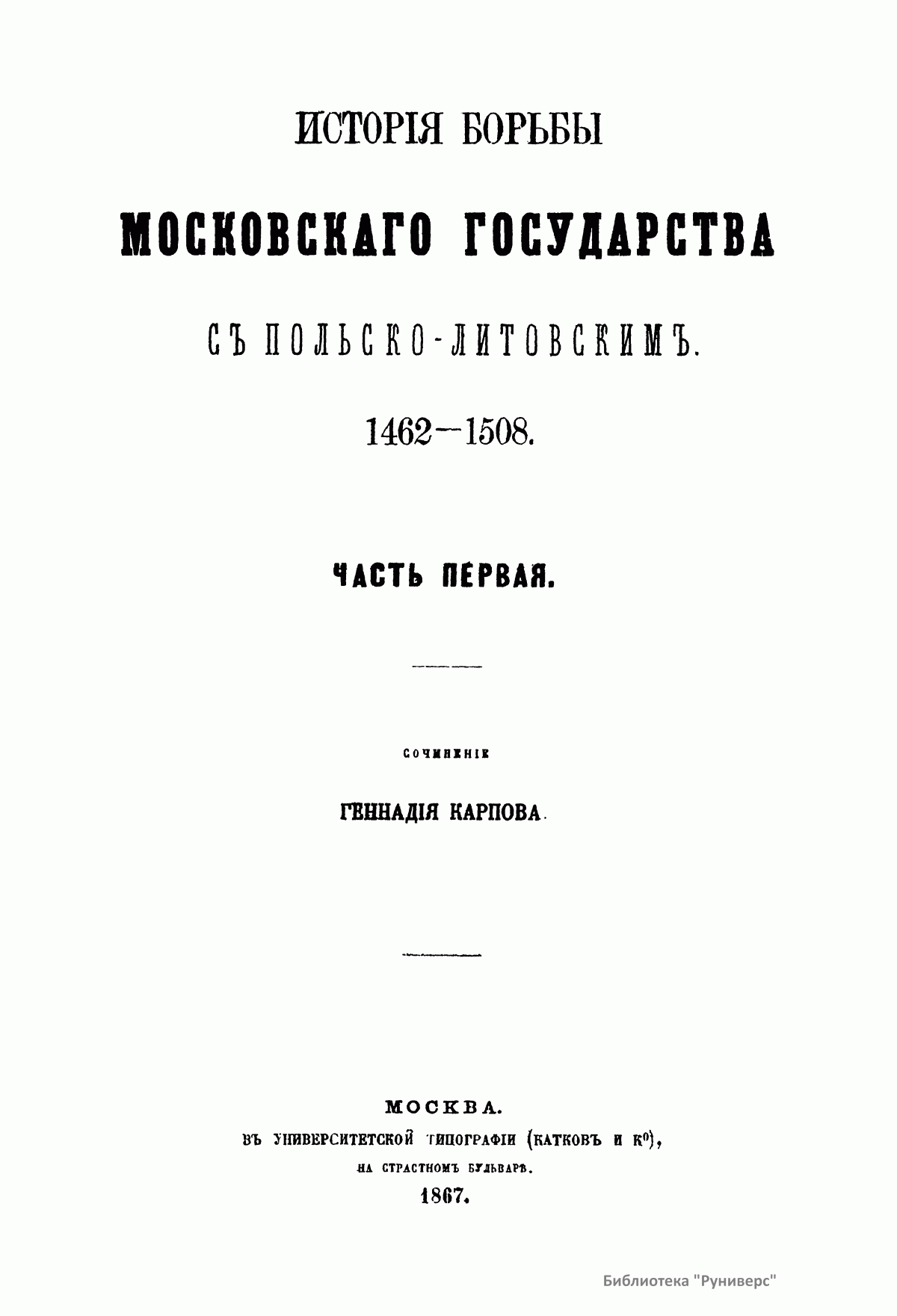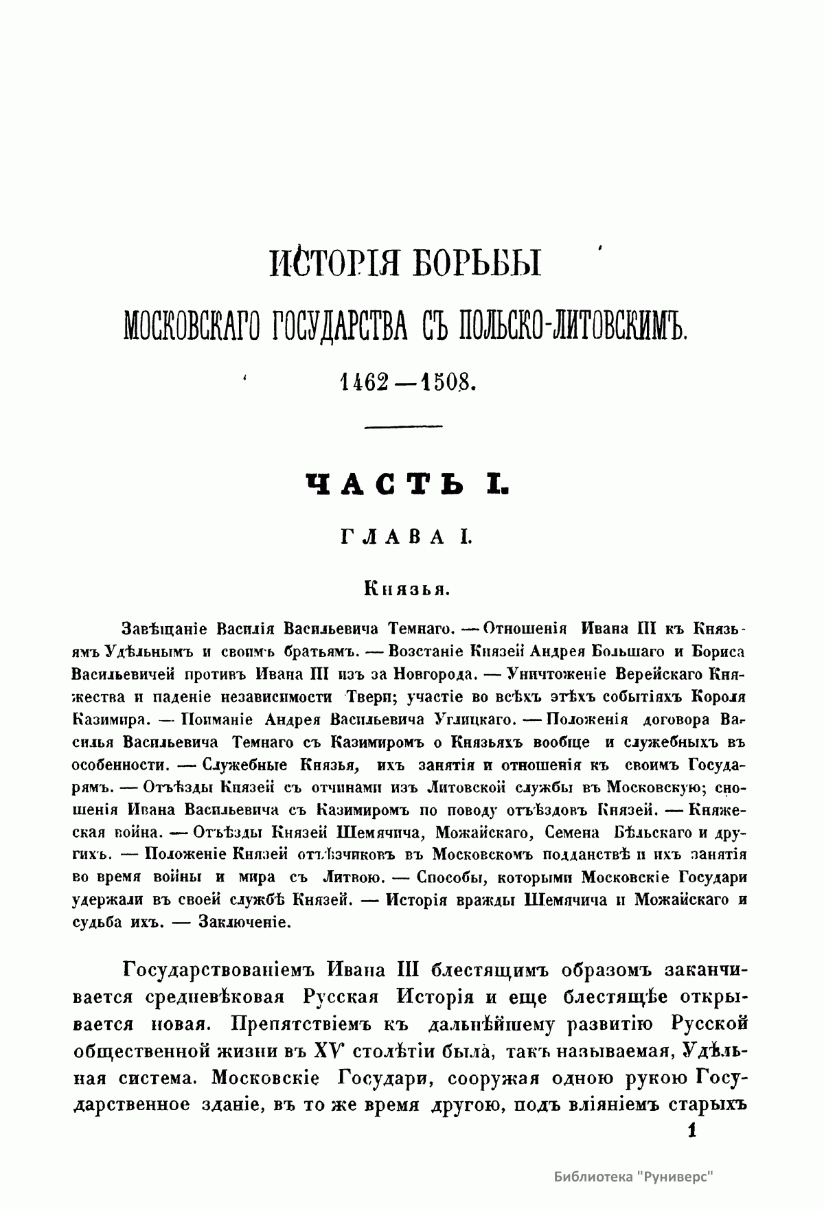 Настоящее издание представляет собой магистерскую диссертацию Карпова Геннадия Федоровича, после защиты которой (1867) он был назначен доцентом в Харьковский университет. Главным источником для изложения истории борьбы Московского государства с Польско-Литовским с 1462-го по 1508 г. служили московские и литовские государственные бумаги. В работе описывается новая эпоха политических отношений двух государств, наступившая с принятием Иваном III титула государя всея Руси и означавшая решимость Московского государства начать наступательное движение на Польско-Литовское. «Столкновение Московского государства с Польско-Литовским исходило из того, что все удельные князья, которые теряли свои владения в пользу Москвы, обыкновенно были союзниками и искали себе защиты и поддержки у представителей старых средневековых порядков, литовско-польских государей. Но главное, чего не могли видеть равнодушно в Польско-Литовском государстве, – это подчинение Москве Новгорода». Литовско-Польский государь приводил на помощь на Московское государство Степняков. Во второй половине XV века Степняки не были скучены в одну массу, а распадались на несколько Орд, причем главная из них, Золотая Орда, при всей своей слабости все еще закрывала собой отломившиеся от нее части. Эти части Золотой Орды были Крым, Казань, а по мере ослабления главной появлялись на сцену одна за другой более мелкие Орды и, наконец, разрозненные, в несколько сот и даже десятков человек – шайки татар, бродившие по степям и высматривавшие свою добычу. Но Степняки в борьбе Московского государства с Польско-Литовским получают значение как орудие, которым хотят управлять оба государства, поэтому их набеги не имеют никаких последствий. Оба государства могли решить свою борьбу только собственными средствами. Книга издана в двух частях. В первой части говорится об уничтожении удельной системы на Руси, завоевании Великого Новгорода и Степняках. Во второй части рассматриваются попытки литовцев остановить наступление со стороны Москвы посредством брачной политики, окончившиеся неудачей и приведшие к невыгодно завершившейся для литовцев войне.