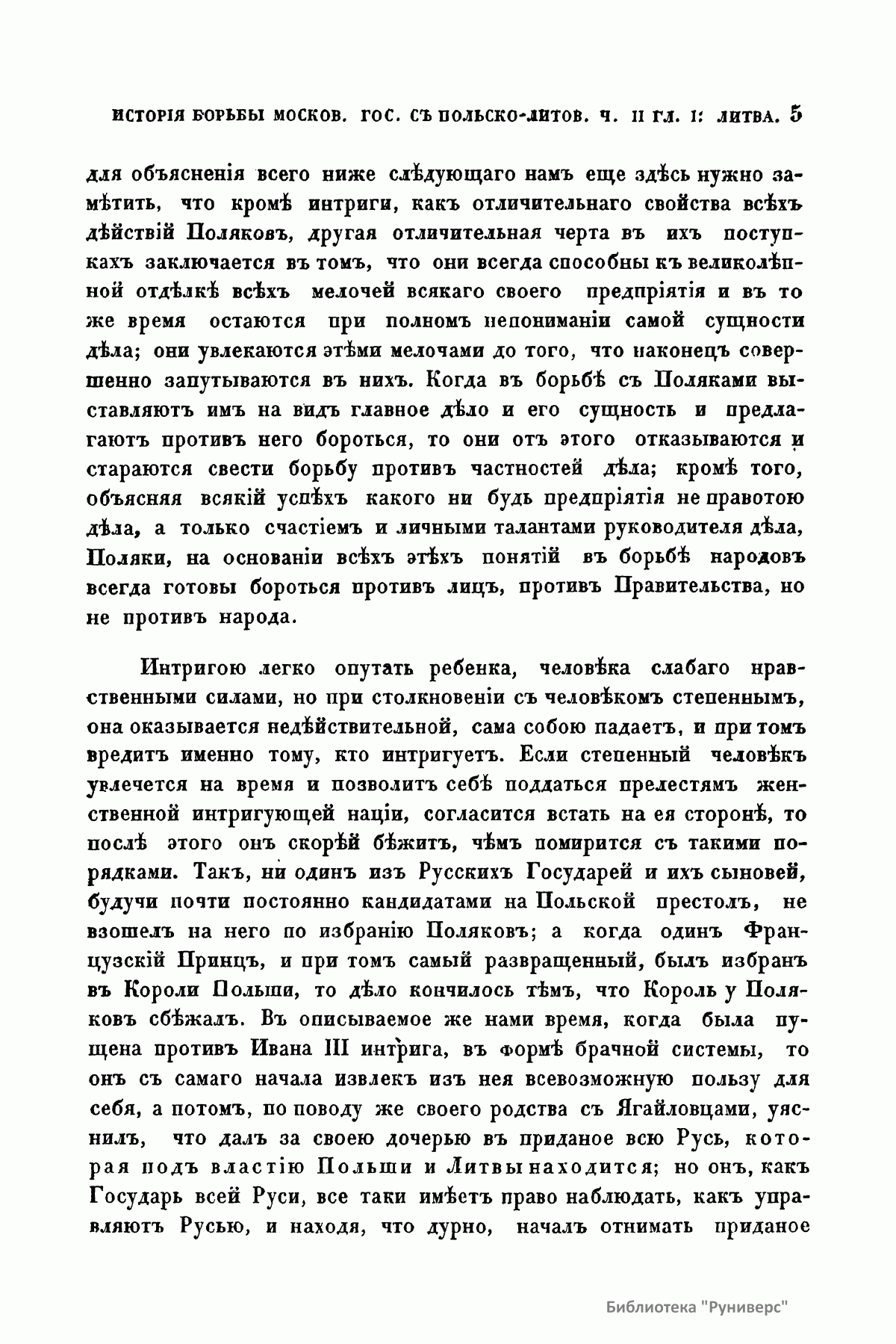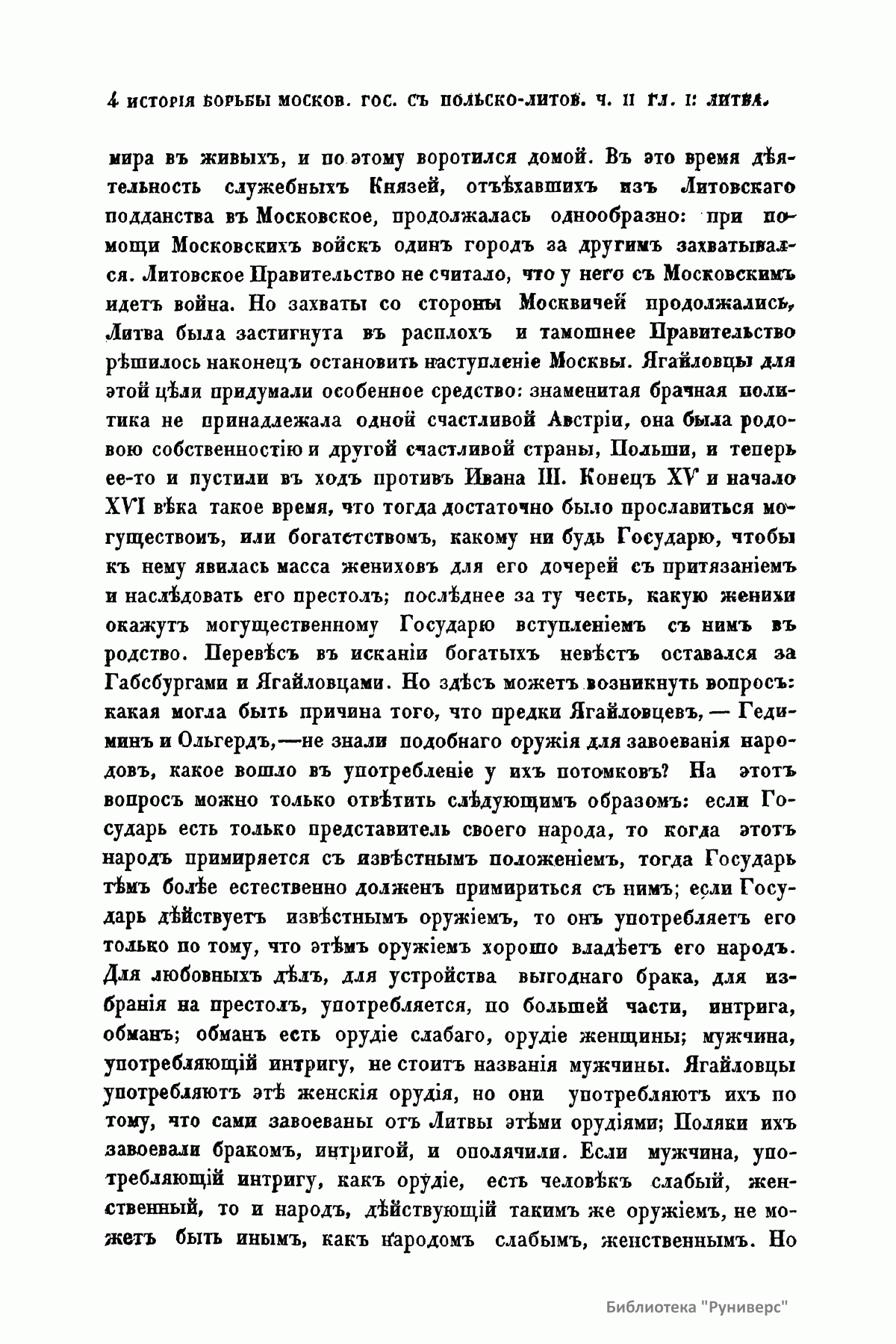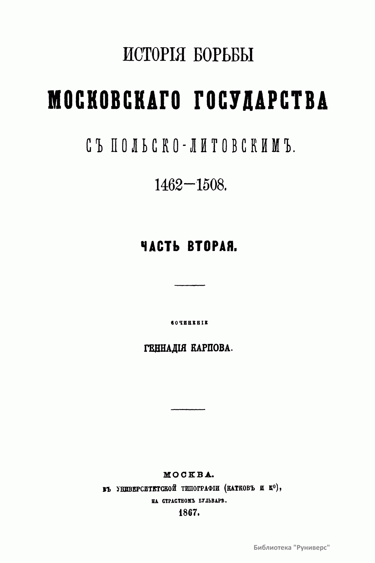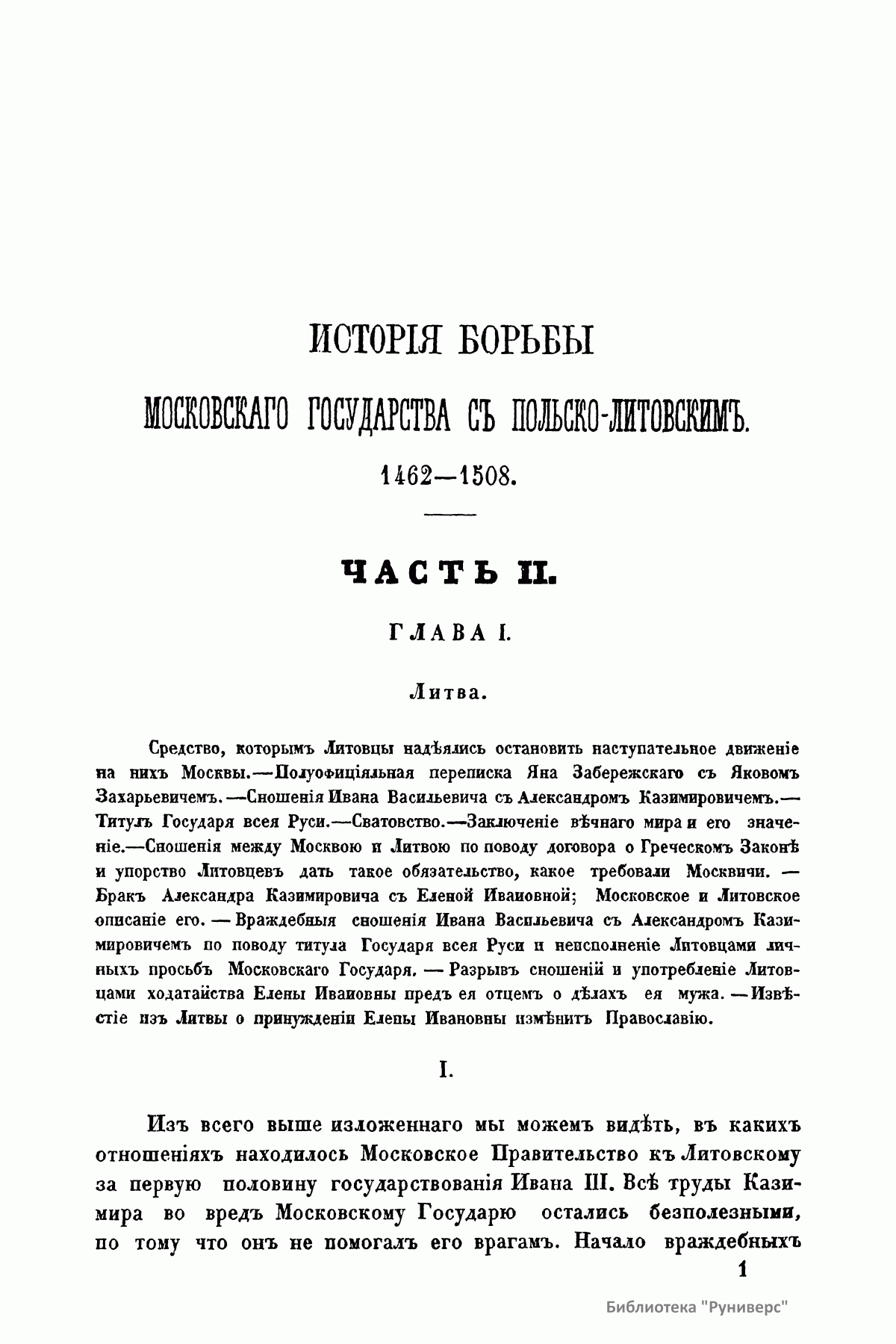 Настоящее издание представляет собой магистерскую диссертацию Карпова Геннадия Федоровича, после защиты которой (1867) он был назначен доцентом в Харьковский университет. Главным источником для изложения истории борьбы Московского государства с Польско-Литовским с 1462-го по 1508 г. служили московские и литовские государственные бумаги. В работе описывается новая эпоха политических отношений двух государств, наступившая с принятием Иваном III титула государя всея Руси и означавшая решимость Московского государства начать наступательное движение на Польско-Литовское. «Столкновение Московского государства с Польско-Литовским исходило из того, что все удельные князья, которые теряли свои владения в пользу Москвы, обыкновенно были союзниками и искали себе защиты и поддержки у представителей старых средневековых порядков, литовско-польских государей. Но главное, чего не могли видеть равнодушно в Польско-Литовском государстве, – это подчинение Москве Новгорода». Литовско-Польский государь приводил на помощь на Московское государство Степняков. Во второй половине XV века Степняки не были скучены в одну массу, а распадались на несколько Орд, причем главная из них, Золотая Орда, при всей своей слабости все еще закрывала собой отломившиеся от нее части. Эти части Золотой Орды были Крым, Казань, а по мере ослабления главной появлялись на сцену одна за другой более мелкие Орды и, наконец, разрозненные, в несколько сот и даже десятков человек – шайки татар, бродившие по степям и высматривавшие свою добычу. Но Степняки в борьбе Московского государства с Польско-Литовским получают значение как орудие, которым хотят управлять оба государства, поэтому их набеги не имеют никаких последствий. Оба государства могли решить свою борьбу только собственными средствами. Книга издана в двух частях. В первой части говорится об уничтожении удельной системы на Руси, завоевании Великого Новгорода и Степняках. Во второй части рассматриваются попытки литовцев остановить наступление со стороны Москвы посредством брачной политики, окончившиеся неудачей и приведшие к невыгодно завершившейся для литовцев войне.