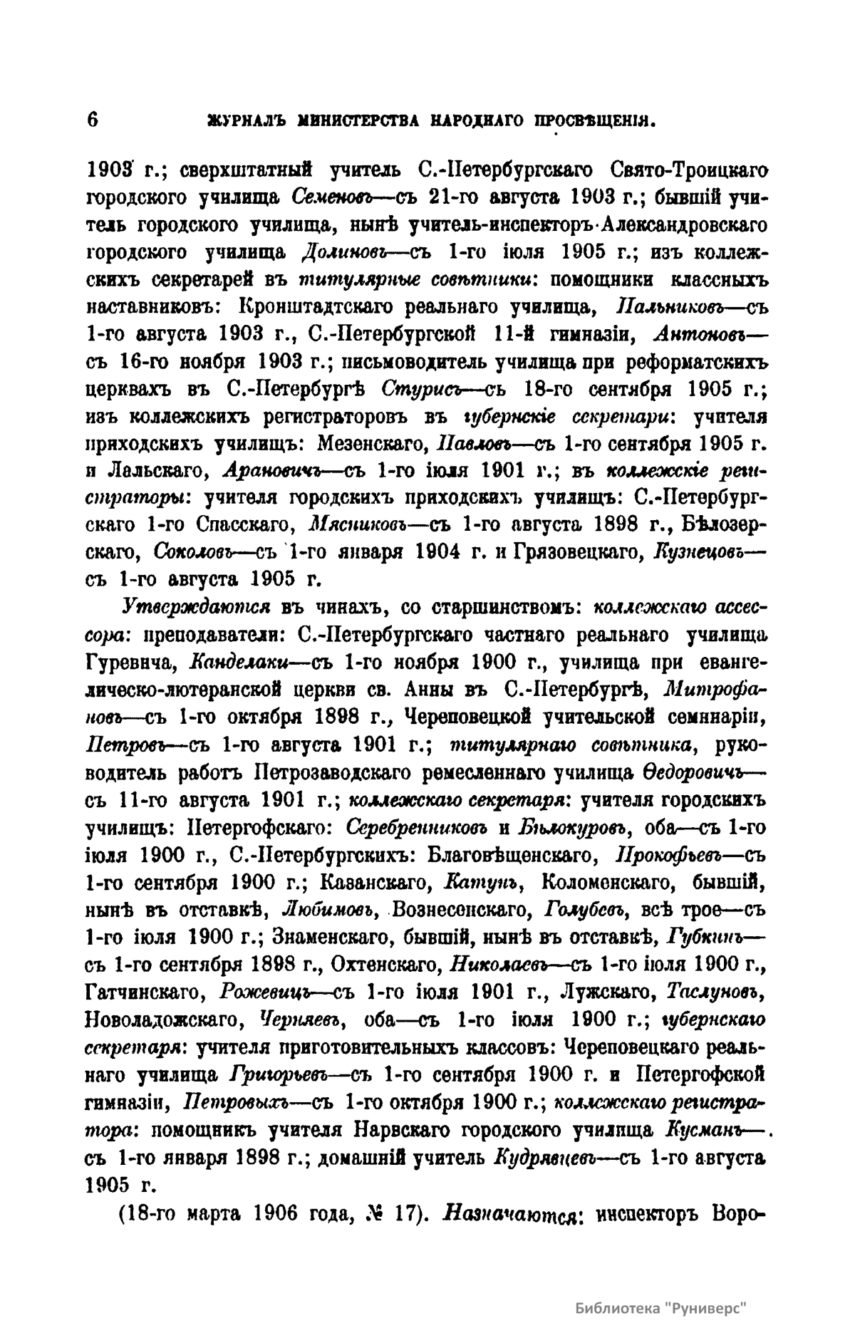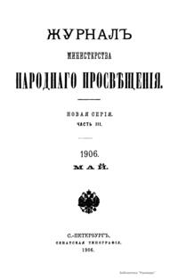 Журнал Министерства народного просвещения выходил с 1834-го по 1917 год. Официальный периодический журнал об успехах просвещения в России. Издатели журнала уверены в том, что «если для каждого человека необходим выход из грубой тьмы невежества и беспрерывное дальнейшее движение к свету, то для народов необходимо попечительное участие правительства в образовании. Только правительство имеет все средства знать и высоту успехов всемирного образования, и настоящие нужды Отечества».