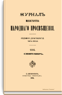 Журнал Министерства народного просвещения выходил с 1834-го по 1917 год. Официальный периодический журнал об успехах просвещения в России. Издатели журнала уверены в том, что «если для каждого человека необходим выход из грубой тьмы невежества и беспрерывное дальнейшее движение к свету, то для народов необходимо попечительное участие правительства в образовании. Только правительство имеет все средства знать и высоту успехов всемирного образования, и настоящие нужды Отечества».