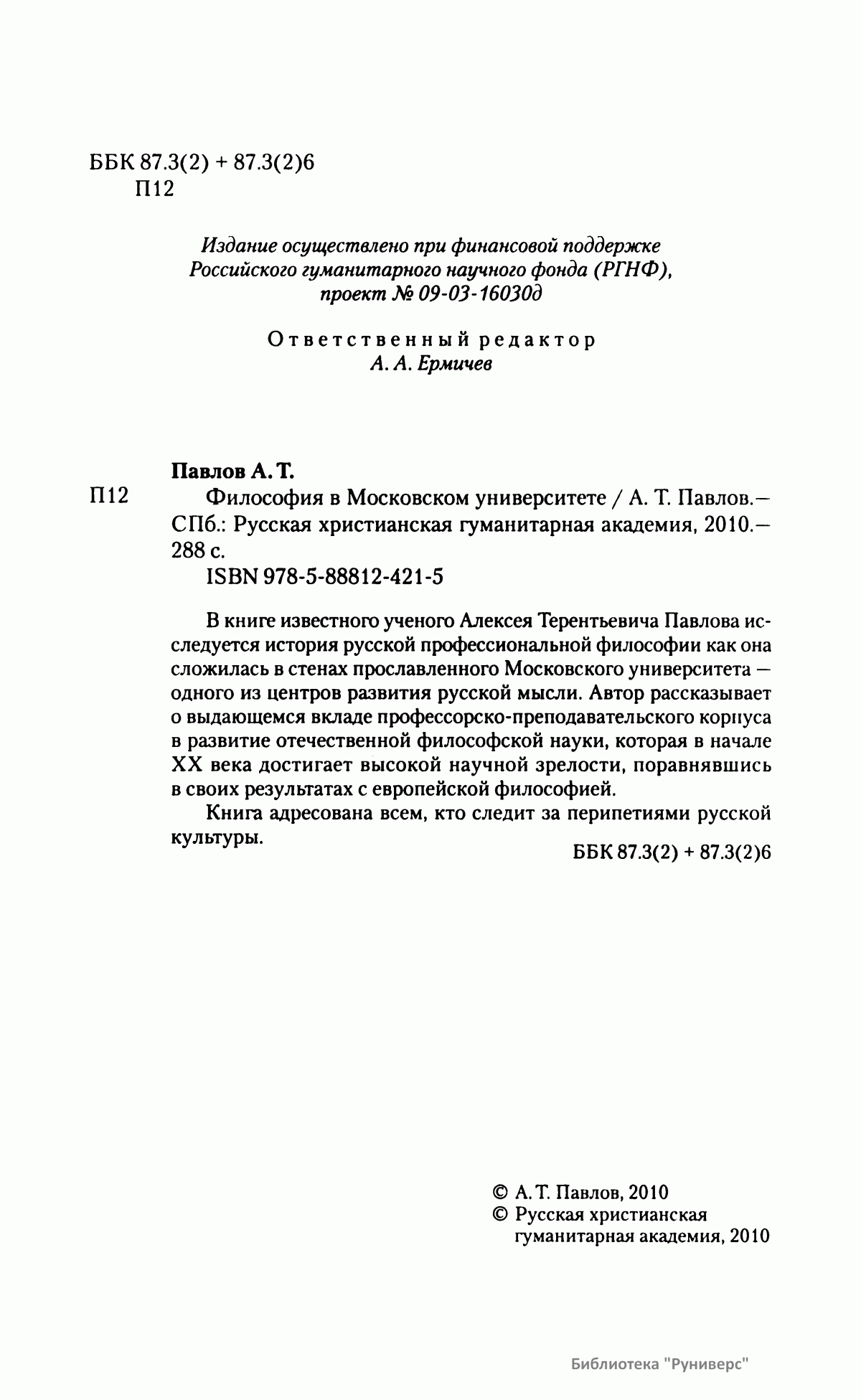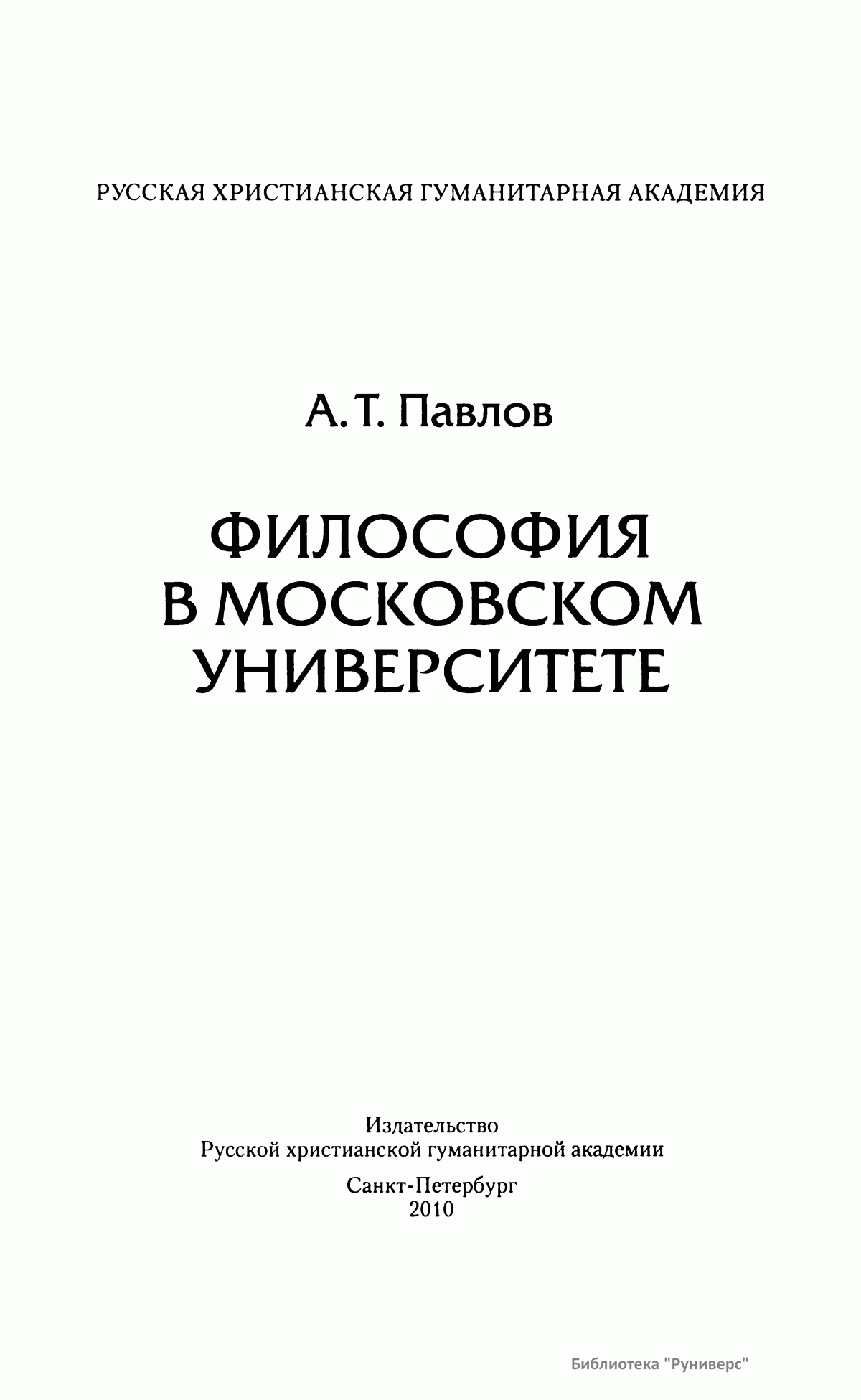 В книге известного ученого Алексея Терентьевича Павлова исследуется история русской профессиональной философии как она сложилась в стенах прославленного Московского университета — одного из центров развития русской мысли. Автор рассказывает о выдающемся вкладе профессорско-преподавательского корпуса в развитие отечественной философской науки, которая в начале XX века достигает высокой научной зрелости, поравнявшись в своих результатах с европейской философией. Книга адресована всем, кто следит за перипетиями русской культуры.