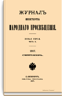 Журнал Министерства народного просвещения выходил с 1834-го по 1917 год. Официальный периодический журнал об успехах просвещения в России. Издатели журнала уверены в том, что «если для каждого человека необходим выход из грубой тьмы невежества и беспрерывное дальнейшее движение к свету, то для народов необходимо попечительное участие правительства в образовании. Только правительство имеет все средства знать и высоту успехов всемирного образования, и настоящие нужды Отечества».