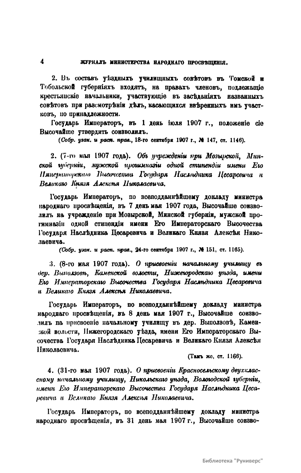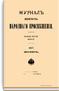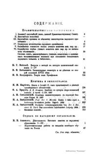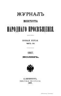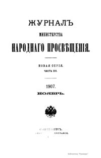 Журнал Министерства народного просвещения выходил с 1834-го по 1917 год. Официальный периодический журнал об успехах просвещения в России. Издатели журнала уверены в том, что «если для каждого человека необходим выход из грубой тьмы невежества и беспрерывное дальнейшее движение к свету, то для народов необходимо попечительное участие правительства в образовании. Только правительство имеет все средства знать и высоту успехов всемирного образования, и настоящие нужды Отечества».