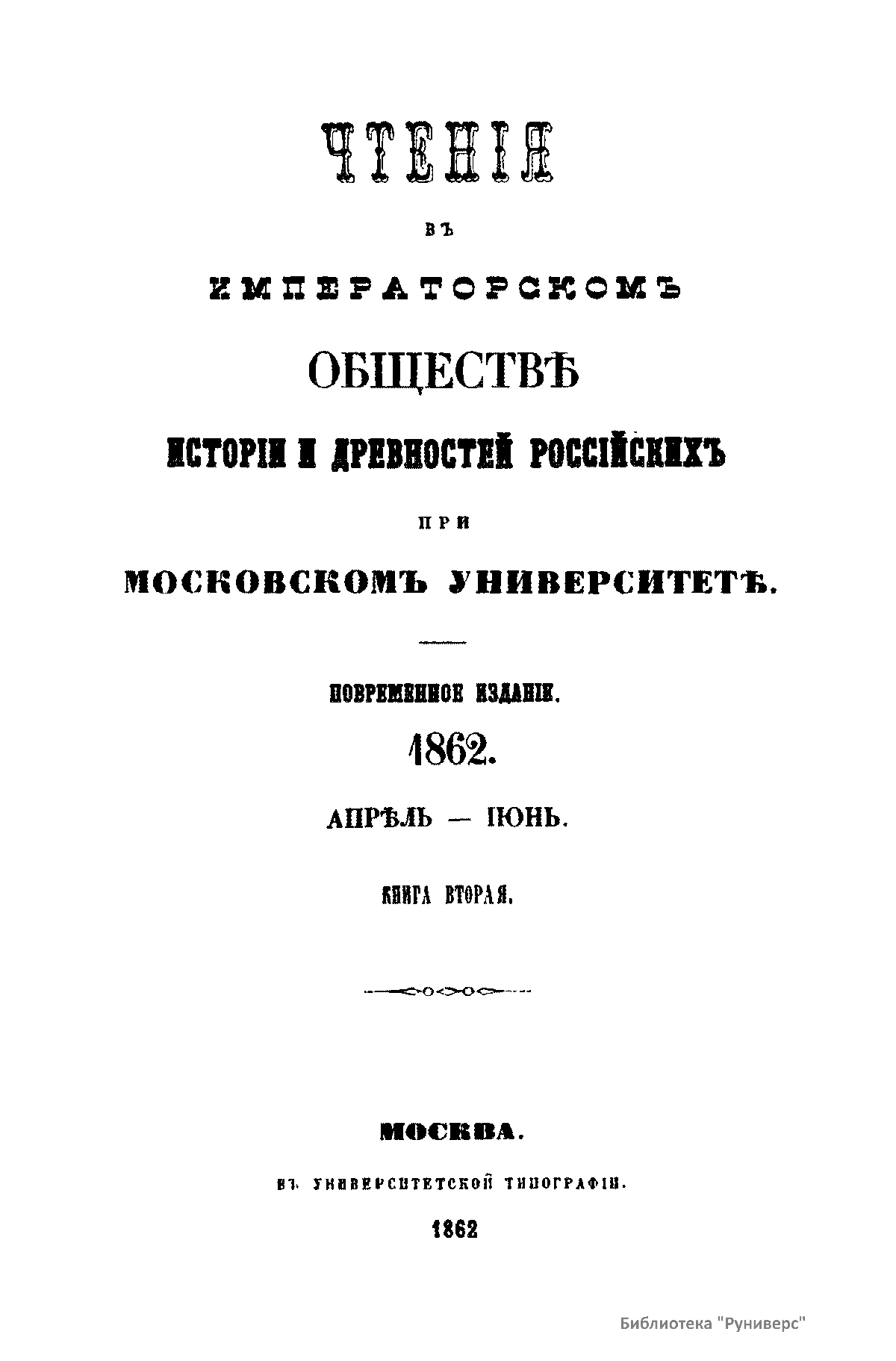 Чтенiя въ Императорскомъ Обществѣ Исторiи и Древностей Россiйскихъ при Московскомъ Университетѣ. 1862. Апрѣль-Iюнь. Книга вторая