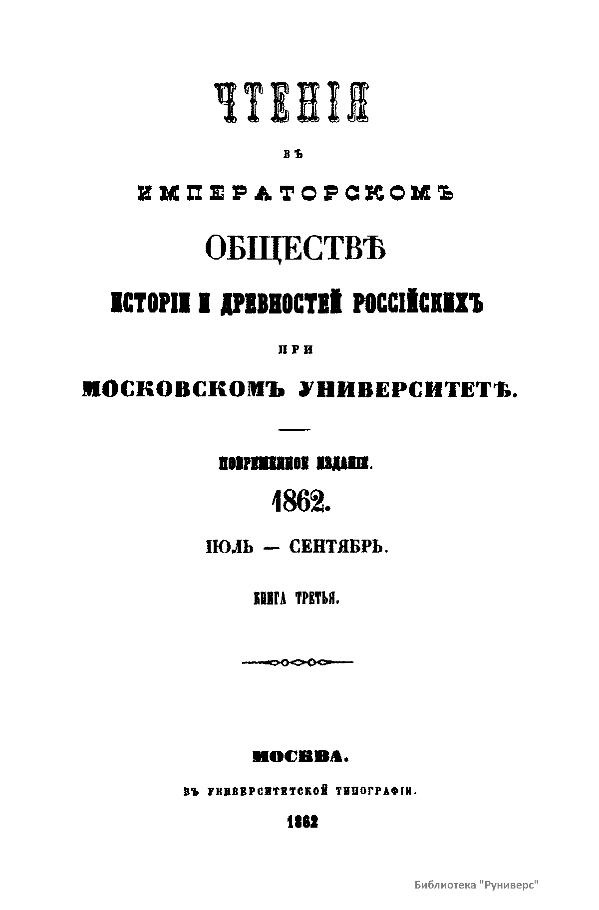 Чтенiя въ Императорскомъ Обществѣ Исторiи и Древностей Россiйскихъ при Московскомъ Университетѣ. 1862. Iюль-Сентябрь. Книга третья