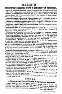 «Чтения в Императорском обществе истории и древностей российских» – периодическое издание трудов Общества. Выпускались отдельными книгами на протяжении 72 лет с десятилетним перерывом. Первая книга вышла в свет в январе 1846 г. Каждая книга состояла из четырех разделов: исторических исследований, отечественных исторических документальных материалов, иностранных материалов и смеси. Публиковались также исследования и материалы по археологии, этнографии, нумизматике, палеографии и другим дисциплинам. До июня 1848 г. было выпущено 23 книги «Чтений». В июньской книге за 1848 г. О. М. Бодянский поместил записки Дж. Флетчера о Московском государстве, что вызвало недовольство Николая I. «Чтения» были закрыты, а Бодянский удален из Московского университета. Издание «Чтений» возобновилось только в 1858 г., когда Бодянский снова стал секретарем общества. Издание приняло славянофильское направление, к прежним четырем разделам «Чтений» прибавился раздел славянских материалов. С 1858 г. «Чтения» выходили в свет четыре раза в год.