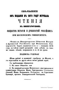 Чтенiя въ Императорскомъ Обществѣ Исторiи и Древностей Россiйскихъ при Московскомъ Университетѣ. 1872. Iюль-Сентябрь. Книга третья