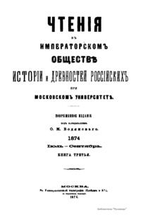 Чтенiя въ Императорскомъ Обществѣ Исторiи и Древностей Россiйскихъ при Московскомъ Университетѣ. 1874. Iюль-Сентябрь. Книга третья
