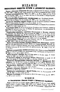 «Чтения в Императорском обществе истории и древностей российских» – периодическое издание трудов Общества. Выпускались отдельными книгами на протяжении 72 лет с десятилетним перерывом. Первая книга вышла в свет в январе 1846 г. Каждая книга состояла из четырех разделов: исторических исследований, отечественных исторических документальных материалов, иностранных материалов и смеси. Публиковались также исследования и материалы по археологии, этнографии, нумизматике, палеографии и другим дисциплинам. До июня 1848 г. было выпущено 23 книги «Чтений». В июньской книге за 1848 г. О. М. Бодянский поместил записки Дж. Флетчера о Московском государстве, что вызвало недовольство Николая I. «Чтения» были закрыты, а Бодянский удален из Московского университета. Издание «Чтений» возобновилось только в 1858 г., когда Бодянский снова стал секретарем общества. Издание приняло славянофильское направление, к прежним четырем разделам «Чтений» прибавился раздел славянских материалов. С 1858 г. «Чтения» выходили в свет четыре раза в год.