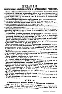 «Чтения в Императорском обществе истории и древностей российских» – периодическое издание трудов Общества. Выпускались отдельными книгами на протяжении 72 лет с десятилетним перерывом. Первая книга вышла в свет в январе 1846 г. Каждая книга состояла из четырех разделов: исторических исследований, отечественных исторических документальных материалов, иностранных материалов и смеси. Публиковались также исследования и материалы по археологии, этнографии, нумизматике, палеографии и другим дисциплинам. До июня 1848 г. было выпущено 23 книги «Чтений». В июньской книге за 1848 г. О. М. Бодянский поместил записки Дж. Флетчера о Московском государстве, что вызвало недовольство Николая I. «Чтения» были закрыты, а Бодянский удален из Московского университета. Издание «Чтений» возобновилось только в 1858 г., когда Бодянский снова стал секретарем общества. Издание приняло славянофильское направление, к прежним четырем разделам «Чтений» прибавился раздел славянских материалов. С 1858 г. «Чтения» выходили в свет четыре раза в год.
