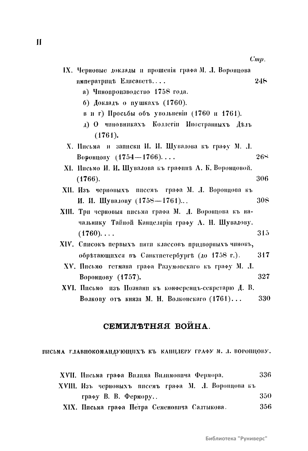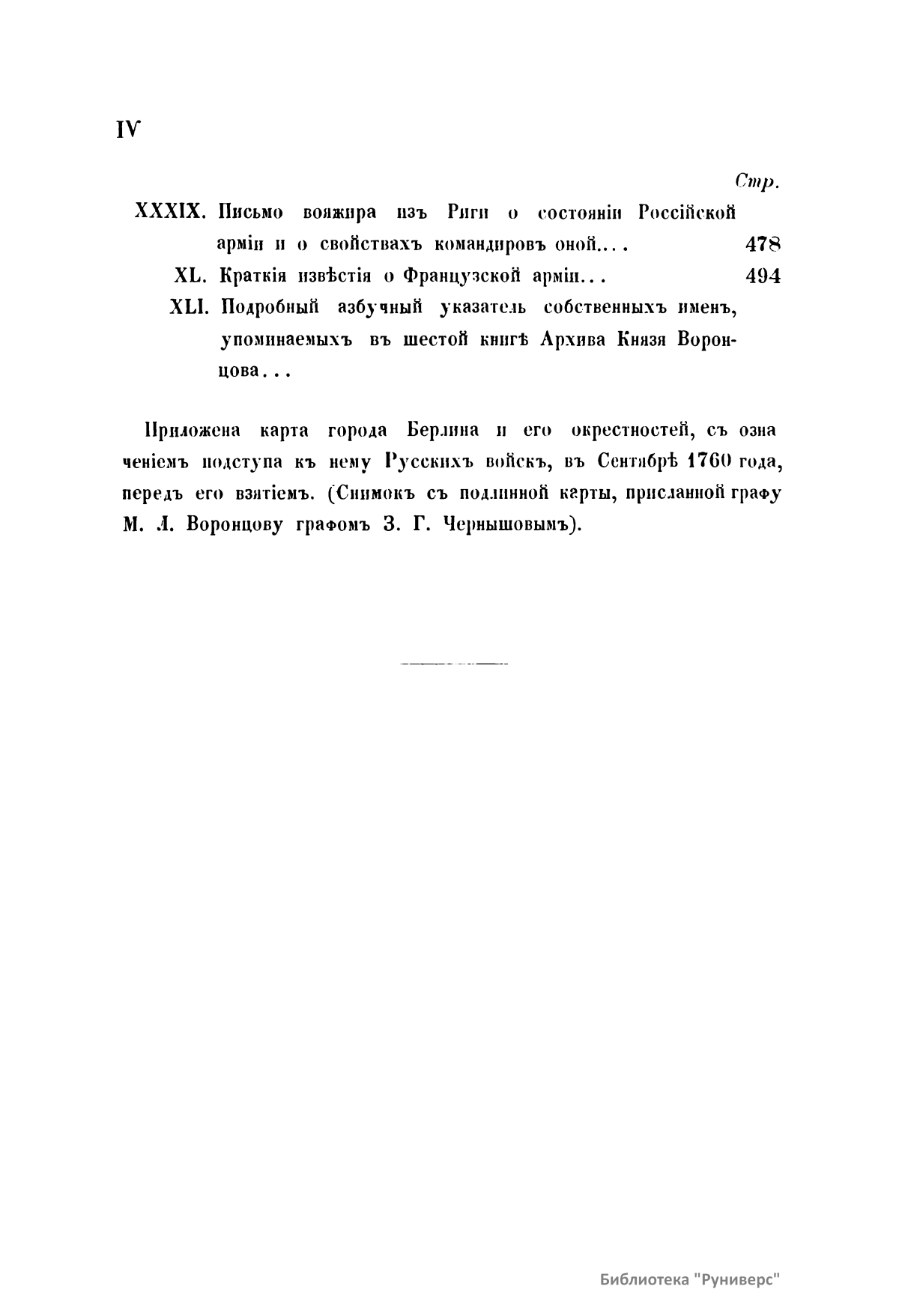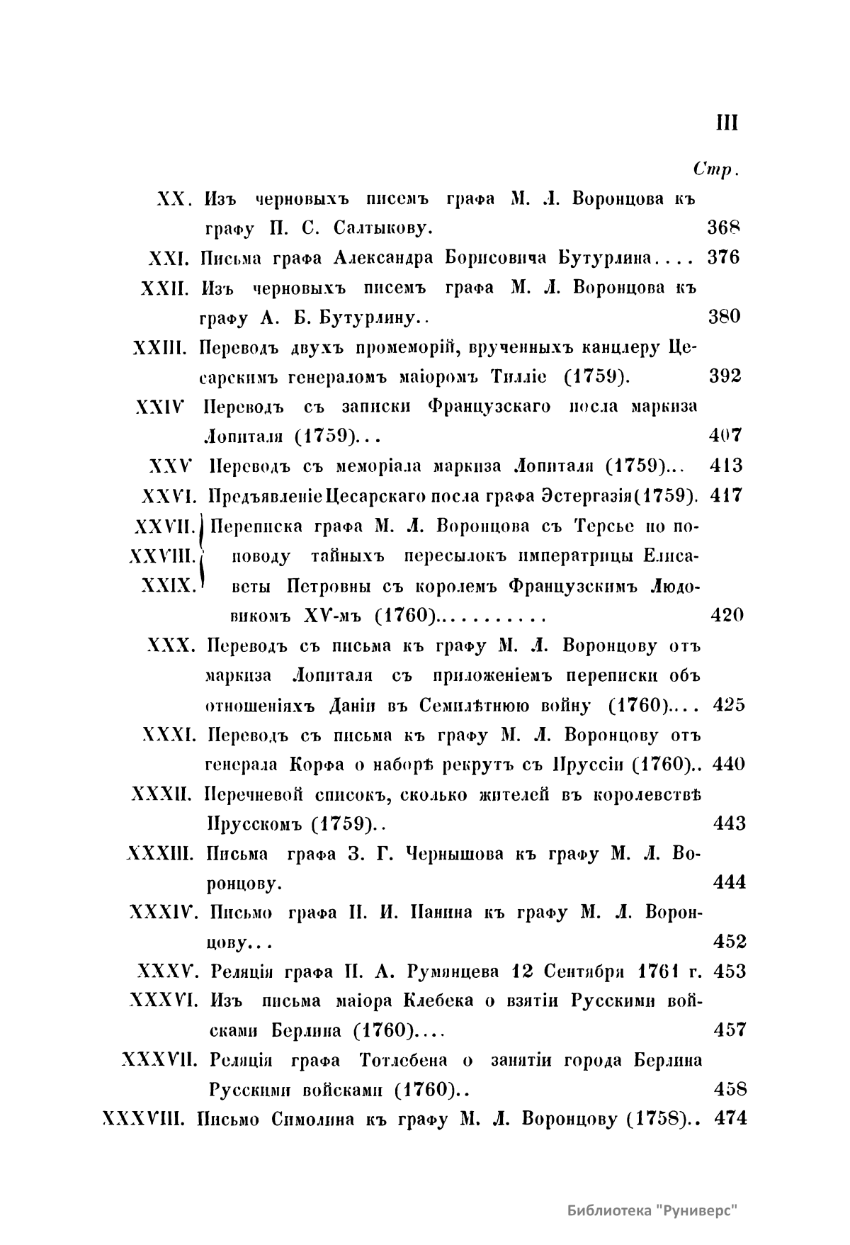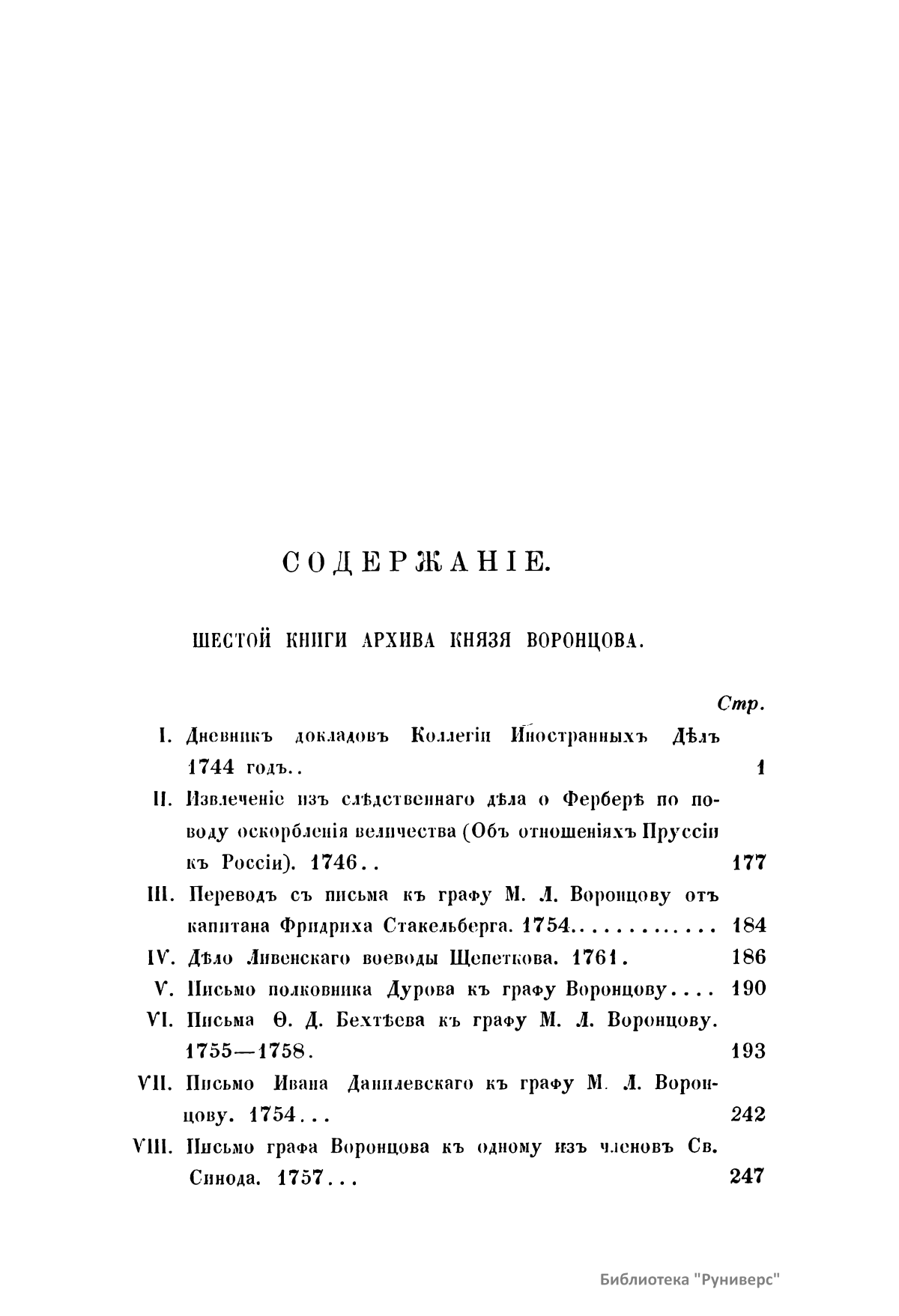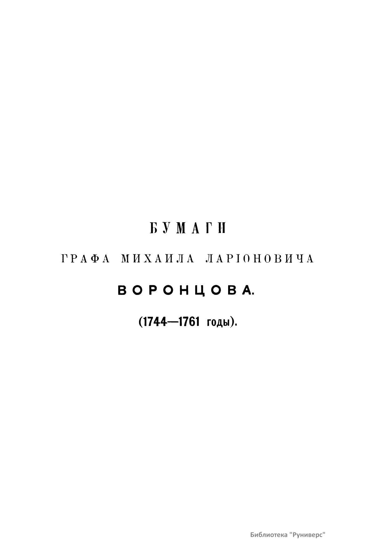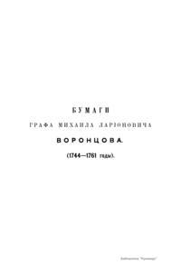 Издание представляет документы из архива графов (с 1845 г. князей) Воронцовых, крупных политических деятелей России XVIII и XIX вв.: Михаила Илларионовича (1714 – 1767) – канцлера при Елизавете Петровне; Романа Илларионовича (1707 – 1783); Александра Романовича (1741 – 1805) – канцлера в 1802 – 1804 гг.; Семена Романовича (1744 – 1832) – посла в Англии в 1785 – 1806 гг.; Михаила Семеновича (1782 – 1856) – фельдмаршала, наместника Кавказа в 1845 – 1853 гг. Архив издан в 40 тт. (1870 – 1895) под редакцией П. И. Бартенева. Содержит огромный материал по внешней политике, по управлению хозяйством Елизаветы Петровны (кн. 1), по делу Миниха и Бирона (кн. 2), о «чумном бунте» 1771 г. в Москве, о движении Е. И. Пугачева (кн. 16), о А. Н. Радищеве (кн. 5, 12, 24). Книга 21-я занята «Записками» Е. Р. Воронцовой (Дашковой). В книге 24-й – свыше 100 писем А. В. Суворова. Среди обширной переписки Воронцовых встречаются письма Вольтера, Д'Аламбера, Жозефа де Местра, Костюшки, Талейрана, Питта и др.