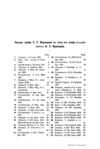 Издание представляет документы из архива графов (с 1845 г. князей) Воронцовых, крупных политических деятелей России XVIII и XIX вв.: Михаила Илларионовича (1714 – 1767) – канцлера при Елизавете Петровне; Романа Илларионовича (1707 – 1783); Александра Романовича (1741 – 1805) – канцлера в 1802 – 1804 гг.; Семена Романовича (1744 – 1832) – посла в Англии в 1785 – 1806 гг.; Михаила Семеновича (1782 – 1856) – фельдмаршала, наместника Кавказа в 1845 – 1853 гг. Архив издан в 40 тт. (1870 – 1895) под редакцией П. И. Бартенева. Содержит огромный материал по внешней политике, по управлению хозяйством Елизаветы Петровны (кн. 1), по делу Миниха и Бирона (кн. 2), о «чумном бунте» 1771 г. в Москве, о движении Е. И. Пугачева (кн. 16), о А. Н. Радищеве (кн. 5, 12, 24). Книга 21-я занята «Записками» Е. Р. Воронцовой (Дашковой). В книге 24-й – свыше 100 писем А. В. Суворова. Среди обширной переписки Воронцовых встречаются письма Вольтера, Д'Аламбера, Жозефа де Местра, Костюшки, Талейрана, Питта и др.