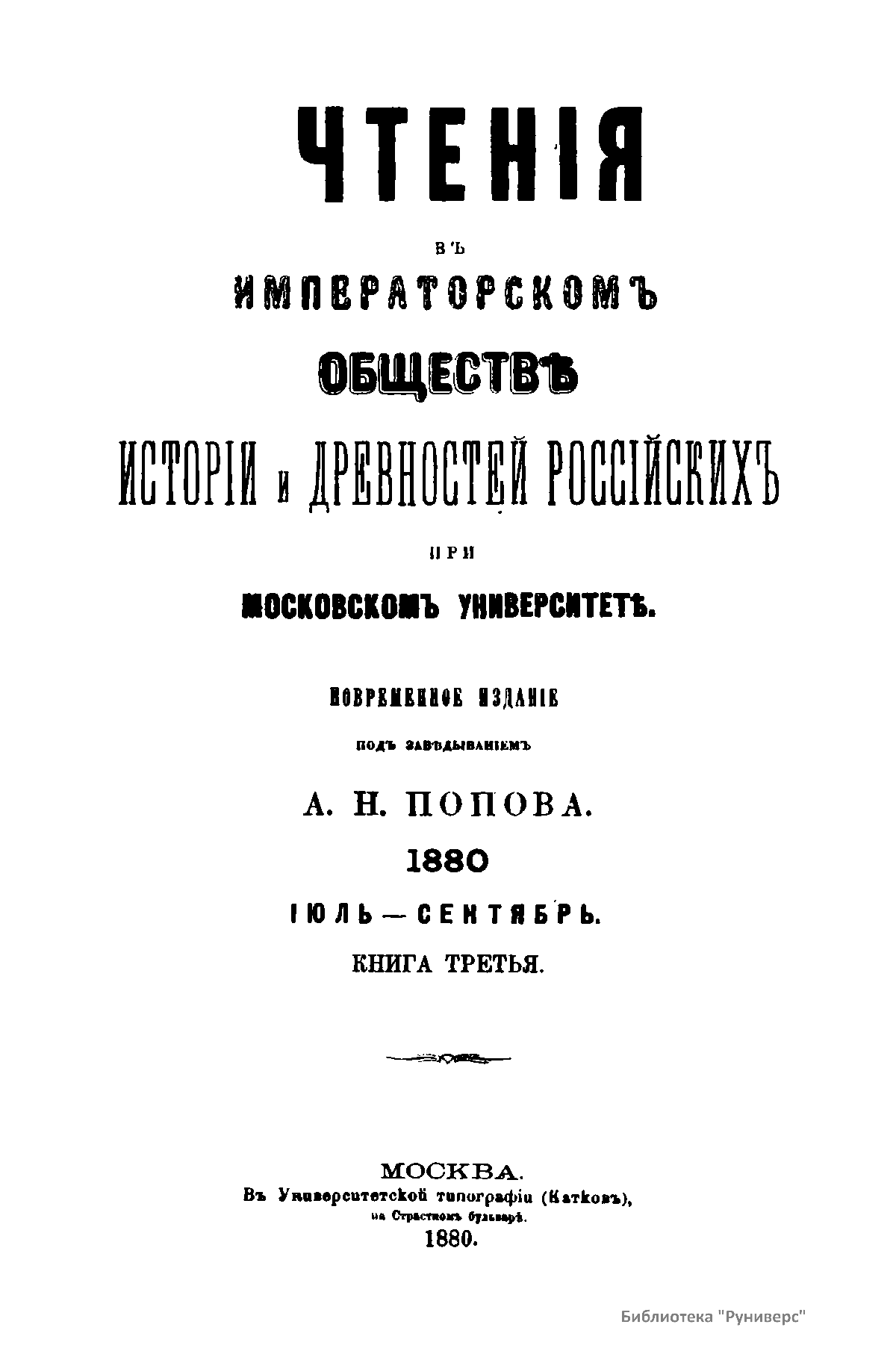 Чтенiя въ Императорскомъ Обществѣ Исторiи и Древностей Россiйскихъ при Московскомъ Университетѣ. 1880. Iюль-Сентябрь. Книга третья