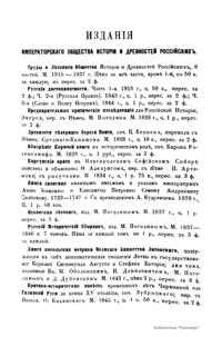«Чтения в Императорском обществе истории и древностей российских» – периодическое издание трудов Общества. Выпускались отдельными книгами на протяжении 72 лет с десятилетним перерывом. Первая книга вышла в свет в январе 1846 г. Каждая книга состояла из четырех разделов: исторических исследований, отечественных исторических документальных материалов, иностранных материалов и смеси. Публиковались также исследования и материалы по археологии, этнографии, нумизматике, палеографии и другим дисциплинам. До июня 1848 г. было выпущено 23 книги «Чтений». В июньской книге за 1848 г. О. М. Бодянский поместил записки Дж. Флетчера о Московском государстве, что вызвало недовольство Николая I. «Чтения» были закрыты, а Бодянский удален из Московского университета. Издание «Чтений» возобновилось только в 1858 г., когда Бодянский снова стал секретарем общества. Издание приняло славянофильское направление, к прежним четырем разделам «Чтений» прибавился раздел славянских материалов. С 1858 г. «Чтения» выходили в свет четыре раза в год.
