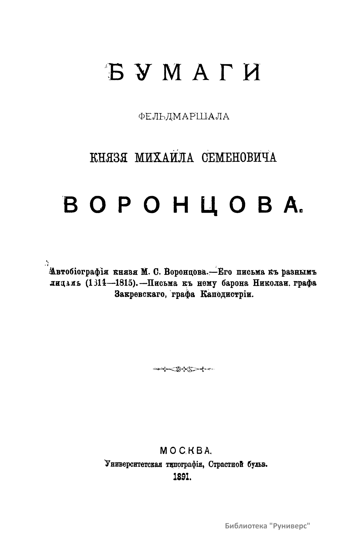 Издание представляет документы из архива графов (с 1845 г. князей) Воронцовых, крупных политических деятелей России XVIII и XIX вв.: Михаила Илларионовича (1714 – 1767) – канцлера при Елизавете Петровне; Романа Илларионовича (1707 – 1783); Александра Романовича (1741 – 1805) – канцлера в 1802 – 1804 гг.; Семена Романовича (1744 – 1832) – посла в Англии в 1785 – 1806 гг.; Михаила Семеновича (1782 – 1856) – фельдмаршала, наместника Кавказа в 1845 – 1853 гг. Архив издан в 40 тт. (1870 – 1895) под редакцией П. И. Бартенева. Содержит огромный материал по внешней политике, по управлению хозяйством Елизаветы Петровны (кн. 1), по делу Миниха и Бирона (кн. 2), о «чумном бунте» 1771 г. в Москве, о движении Е. И. Пугачева (кн. 16), о А. Н. Радищеве (кн. 5, 12, 24). Книга 21-я занята «Записками» Е. Р. Воронцовой (Дашковой). В книге 24-й – свыше 100 писем А. В. Суворова. Среди обширной переписки Воронцовых встречаются письма Вольтера, Д'Аламбера, Жозефа де Местра, Костюшки, Талейрана, Питта и др.