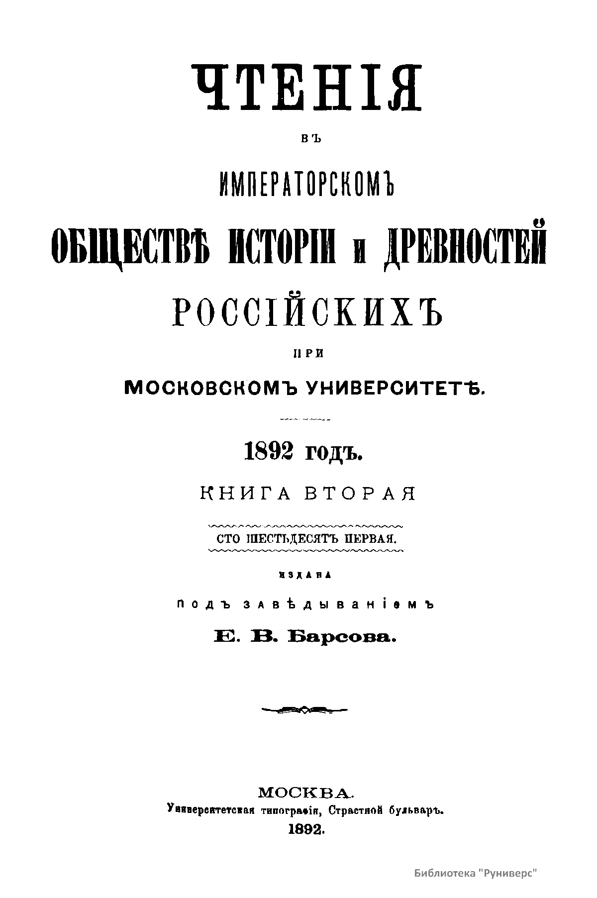 Чтенiя въ Императорскомъ Обществѣ Исторiи и Древностей Россiйскихъ при Московскомъ Университетѣ. 1892 годъ. Книга вторая