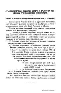 «Чтения в Императорском обществе истории и древностей российских» – периодическое издание трудов Общества. Выпускались отдельными книгами на протяжении 72 лет с десятилетним перерывом. Первая книга вышла в свет в январе 1846 г. Каждая книга состояла из четырех разделов: исторических исследований, отечественных исторических документальных материалов, иностранных материалов и смеси. Публиковались также исследования и материалы по археологии, этнографии, нумизматике, палеографии и другим дисциплинам. До июня 1848 г. было выпущено 23 книги «Чтений». В июньской книге за 1848 г. О. М. Бодянский поместил записки Дж. Флетчера о Московском государстве, что вызвало недовольство Николая I. «Чтения» были закрыты, а Бодянский удален из Московского университета. Издание «Чтений» возобновилось только в 1858 г., когда Бодянский снова стал секретарем общества. Издание приняло славянофильское направление, к прежним четырем разделам «Чтений» прибавился раздел славянских материалов. С 1858 г. «Чтения» выходили в свет четыре раза в год.