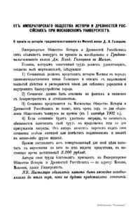 «Чтения в Императорском обществе истории и древностей российских» – периодическое издание трудов Общества. Выпускались отдельными книгами на протяжении 72 лет с десятилетним перерывом. Первая книга вышла в свет в январе 1846 г. Каждая книга состояла из четырех разделов: исторических исследований, отечественных исторических документальных материалов, иностранных материалов и смеси. Публиковались также исследования и материалы по археологии, этнографии, нумизматике, палеографии и другим дисциплинам. До июня 1848 г. было выпущено 23 книги «Чтений». В июньской книге за 1848 г. О. М. Бодянский поместил записки Дж. Флетчера о Московском государстве, что вызвало недовольство Николая I. «Чтения» были закрыты, а Бодянский удален из Московского университета. Издание «Чтений» возобновилось только в 1858 г., когда Бодянский снова стал секретарем общества. Издание приняло славянофильское направление, к прежним четырем разделам «Чтений» прибавился раздел славянских материалов. С 1858 г. «Чтения» выходили в свет четыре раза в год.
