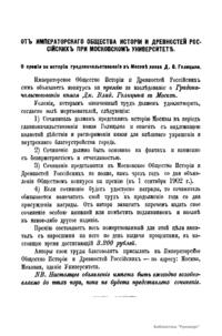 «Чтения в Императорском обществе истории и древностей российских» – периодическое издание трудов Общества. Выпускались отдельными книгами на протяжении 72 лет с десятилетним перерывом. Первая книга вышла в свет в январе 1846 г. Каждая книга состояла из четырех разделов: исторических исследований, отечественных исторических документальных материалов, иностранных материалов и смеси. Публиковались также исследования и материалы по археологии, этнографии, нумизматике, палеографии и другим дисциплинам. До июня 1848 г. было выпущено 23 книги «Чтений». В июньской книге за 1848 г. О. М. Бодянский поместил записки Дж. Флетчера о Московском государстве, что вызвало недовольство Николая I. «Чтения» были закрыты, а Бодянский удален из Московского университета. Издание «Чтений» возобновилось только в 1858 г., когда Бодянский снова стал секретарем общества. Издание приняло славянофильское направление, к прежним четырем разделам «Чтений» прибавился раздел славянских материалов. С 1858 г. «Чтения» выходили в свет четыре раза в год.