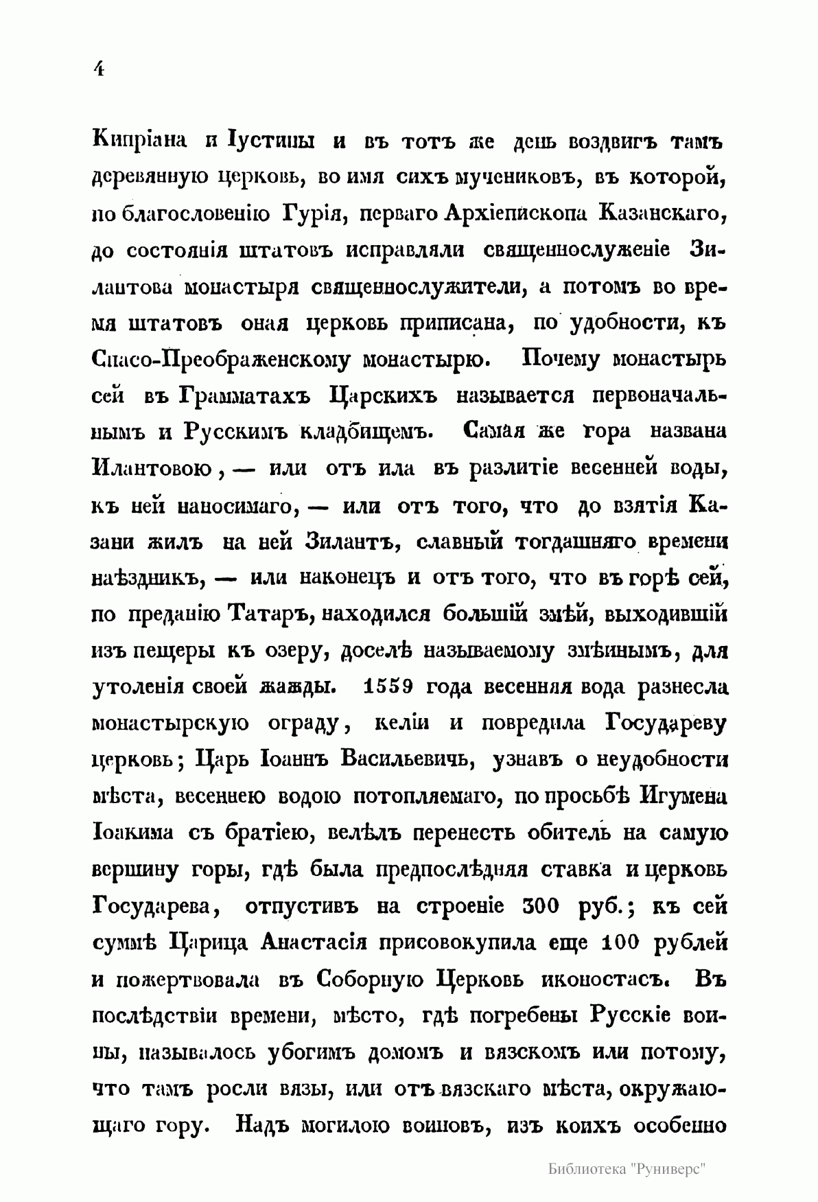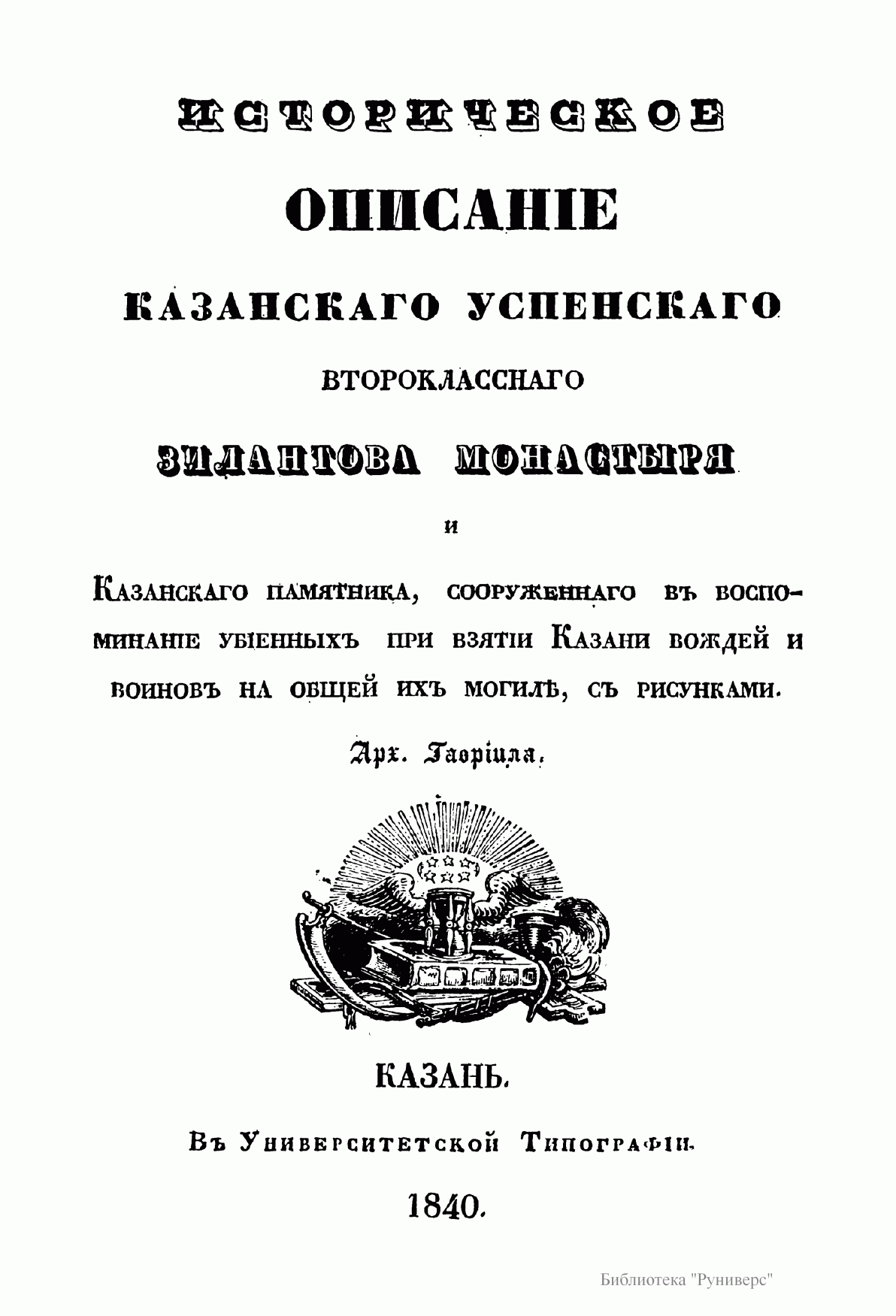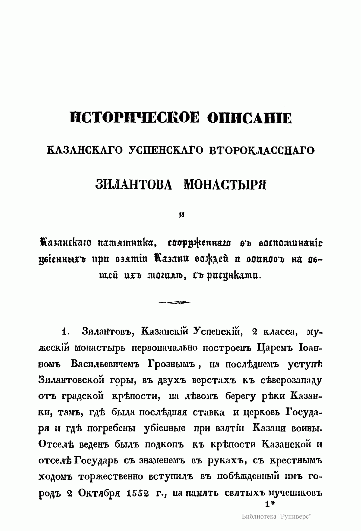 Историческое описанiе казанскаго успенскаго второкласснаго Зилантова монастыря и Казанскаго памятника, сооруженнаго въ воспоминанiе убiенныхъ при взятiи Казани вождей и воиновъ на общей ихъ могилѣ, съ рисунками