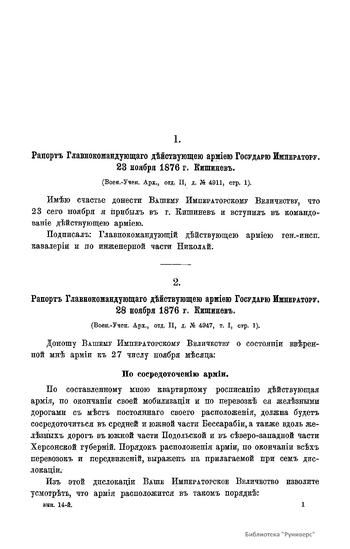 Сборникъ матерiаловъ по русско-турецкой войнѣ 1877-1878 г.г. на Балканскомъ полуостровѣ. Выпускъ 14. Рапорты Главнокомандующаго Великаго Князя Николая Николаевича Государю Императору