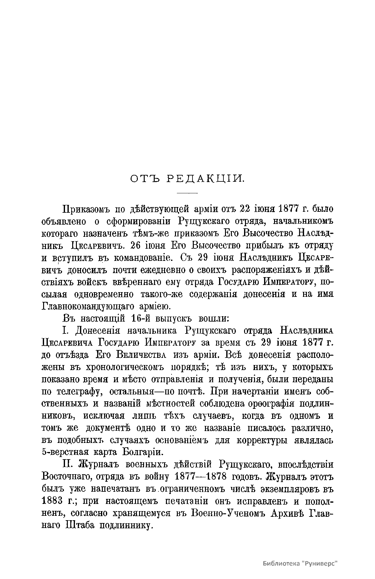 Сборникъ матерiаловъ по русско-турецкой войнѣ 1877-1878 г.г. на Балканскомъ полуостровѣ. Выпускъ 16. I. Донесенiя Начальника Рущукскаго отряда Наслѣдника Цесаревича Государю Императору съ 29 iюня по 2 декабря 1877 г. II. Журналъ военныхъ дѣйствiй Рущукскаго, впослѣдствши Восточнаго, отряда въ войну 1877-1878 годовъ