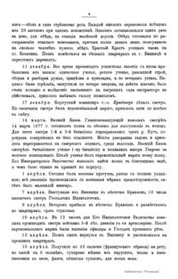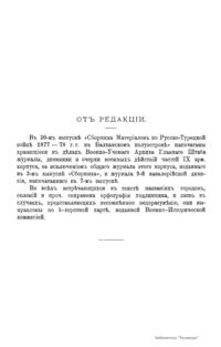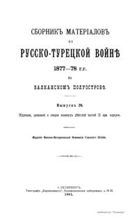 Военно-историческая комиссия Генерального штаба представляет сборник материалов по русско-турецкой войне 1877 – 1878 гг. на Балканском полуострове в 97 выпусках. Издание формирует полное представление о военных действиях и участниках этой войны. Русско-турецкая война 1877 – 1878 гг. была вызвана нежеланием Турции принять меры к улучшению положения подвластных ей христианских княжеств, обусловленному парижским трактатом 1856 г, и стремлением России укрепить свое влияние на Балканах. Способствовала освобождению народов Балканского полуострова от османского владычества. Россия объявила войну Турции 12 апреля 1877 г. Основные события: 1877 – сражение на Шипке, осада и взятие русскими войсками Плевны и Карса; 1878 – зимний переход русской армии через Балканский хребет, победы у Шипки – Шейново, Филиппополя, взятие Адрианополя. Завершилась Сан-Стефанским миром 1878 г., который обеспечил независимость балканским народам и территориальные приобретения России. Но Берлинский трактат ограничил независимость Болгарии и влияние России на Балканах.