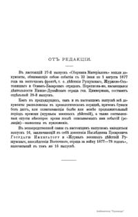 Военно-историческая комиссия Генерального штаба представляет сборник материалов по русско-турецкой войне 1877 – 1878 гг. на Балканском полуострове в 97 выпусках. Издание формирует полное представление о военных действиях и участниках этой войны. Русско-турецкая война 1877 – 1878 гг. была вызвана нежеланием Турции принять меры к улучшению положения подвластных ей христианских княжеств, обусловленному парижским трактатом 1856 г, и стремлением России укрепить свое влияние на Балканах. Способствовала освобождению народов Балканского полуострова от османского владычества. Россия объявила войну Турции 12 апреля 1877 г. Основные события: 1877 – сражение на Шипке, осада и взятие русскими войсками Плевны и Карса; 1878 – зимний переход русской армии через Балканский хребет, победы у Шипки – Шейново, Филиппополя, взятие Адрианополя. Завершилась Сан-Стефанским миром 1878 г., который обеспечил независимость балканским народам и территориальные приобретения России. Но Берлинский трактат ограничил независимость Болгарии и влияние России на Балканах.