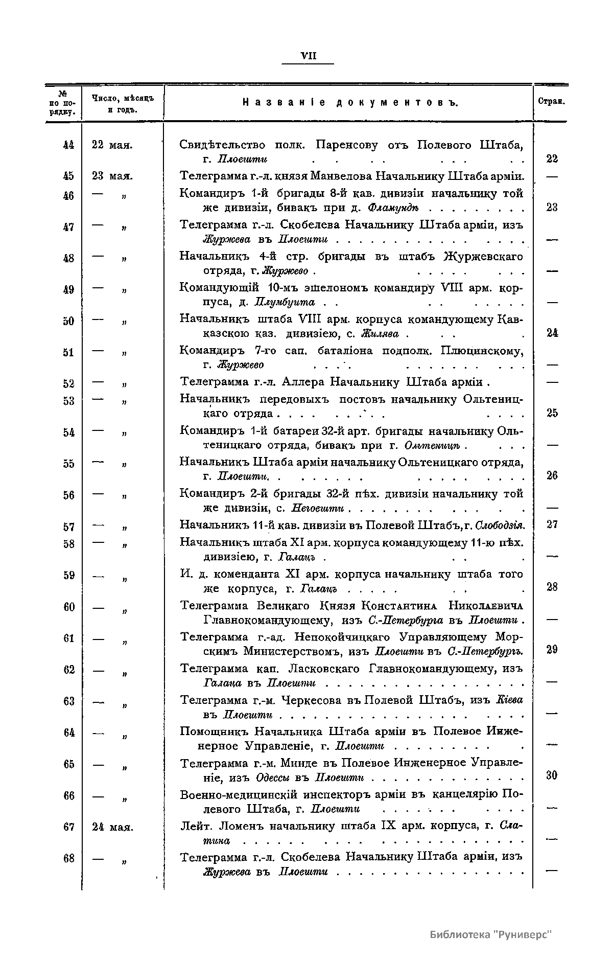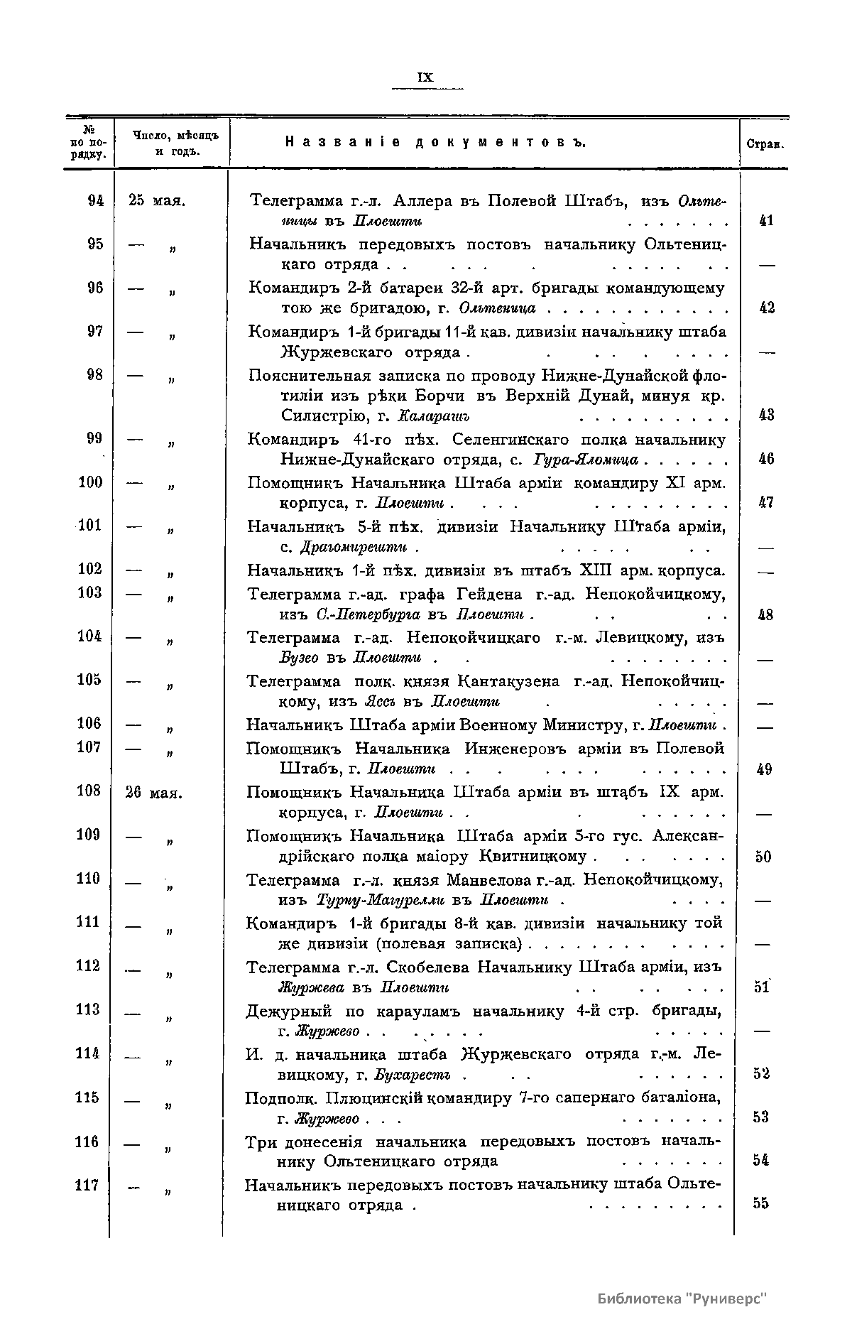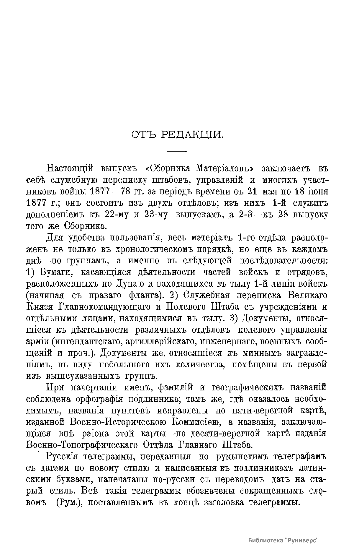 Сборникъ матерiаловъ по русско-турецкой войнѣ 1877-1878 г.г. на Балканскомъ полуостровѣ. Выпускъ 30. I. Дополнительные документы къ стратегическому развертыванiю Русской армiи въ Румынiи и подготовкѣ къ переправѣ черезъ Дунай. II. Минныя загражденiя на р. Дунаѣ. III. Устройство и дѣятельность тыловыхъ учрежденiй армiи. IV. Дополнительные документы относительно дѣйствiй Нижне-Дунайскаго отряда. Съ 21 мая по 18 iюня 1877 г.