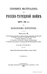 Военно-историческая комиссия Генерального штаба представляет сборник материалов по русско-турецкой войне 1877 – 1878 гг. на Балканском полуострове в 97 выпусках. Издание формирует полное представление о военных действиях и участниках этой войны. Русско-турецкая война 1877 – 1878 гг. была вызвана нежеланием Турции принять меры к улучшению положения подвластных ей христианских княжеств, обусловленному парижским трактатом 1856 г, и стремлением России укрепить свое влияние на Балканах. Способствовала освобождению народов Балканского полуострова от османского владычества. Россия объявила войну Турции 12 апреля 1877 г. Основные события: 1877 – сражение на Шипке, осада и взятие русскими войсками Плевны и Карса; 1878 – зимний переход русской армии через Балканский хребет, победы у Шипки – Шейново, Филиппополя, взятие Адрианополя. Завершилась Сан-Стефанским миром 1878 г., который обеспечил независимость балканским народам и территориальные приобретения России. Но Берлинский трактат ограничил независимость Болгарии и влияние России на Балканах.