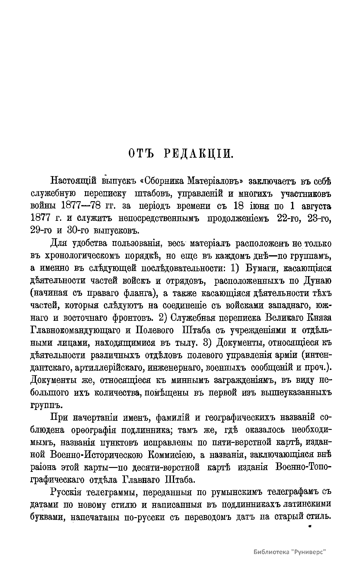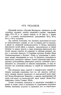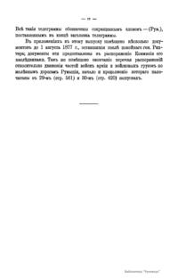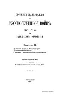 Военно-историческая комиссия Генерального штаба представляет сборник материалов по русско-турецкой войне 1877 – 1878 гг. на Балканском полуострове в 97 выпусках. Издание формирует полное представление о военных действиях и участниках этой войны. Русско-турецкая война 1877 – 1878 гг. была вызвана нежеланием Турции принять меры к улучшению положения подвластных ей христианских княжеств, обусловленному парижским трактатом 1856 г, и стремлением России укрепить свое влияние на Балканах. Способствовала освобождению народов Балканского полуострова от османского владычества. Россия объявила войну Турции 12 апреля 1877 г. Основные события: 1877 – сражение на Шипке, осада и взятие русскими войсками Плевны и Карса; 1878 – зимний переход русской армии через Балканский хребет, победы у Шипки – Шейново, Филиппополя, взятие Адрианополя. Завершилась Сан-Стефанским миром 1878 г., который обеспечил независимость балканским народам и территориальные приобретения России. Но Берлинский трактат ограничил независимость Болгарии и влияние России на Балканах.