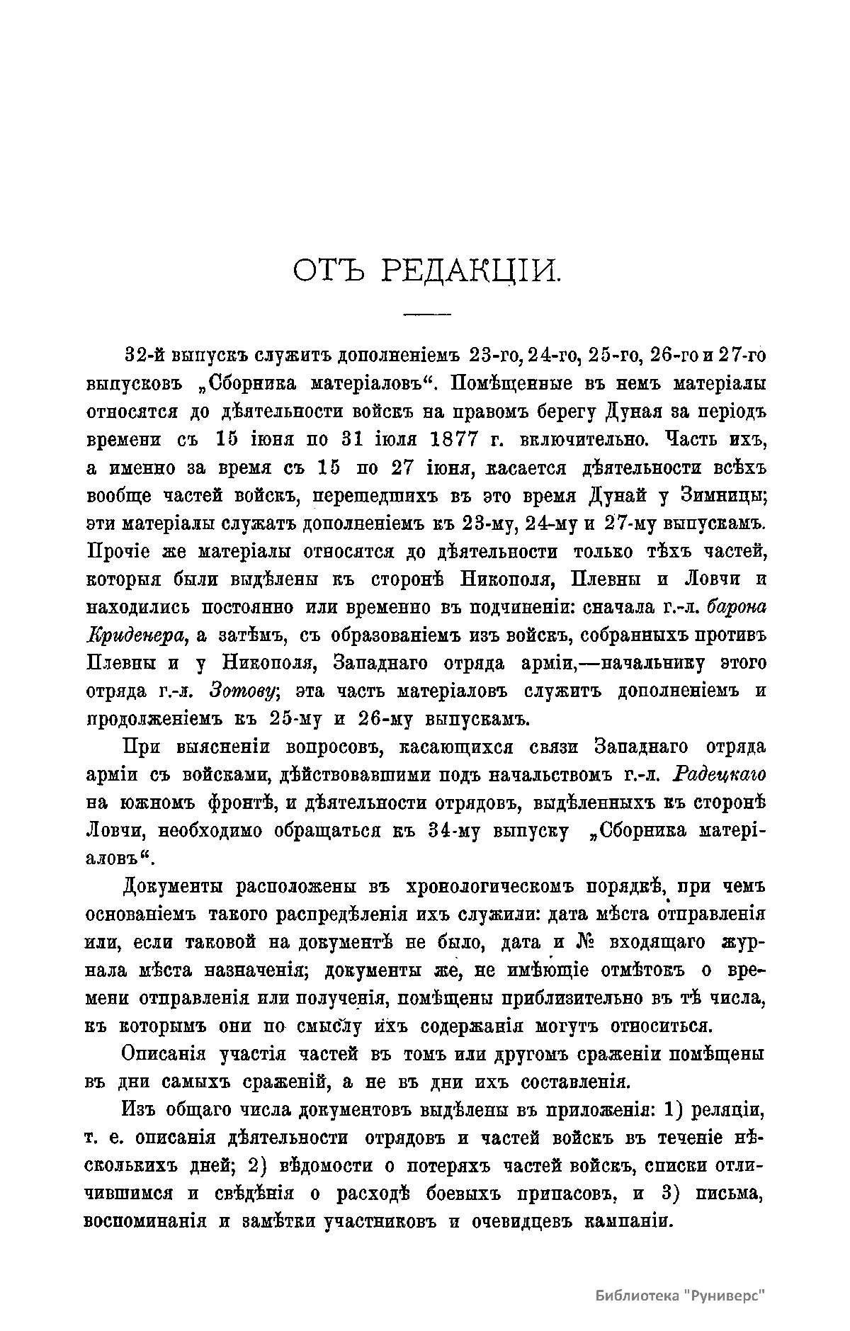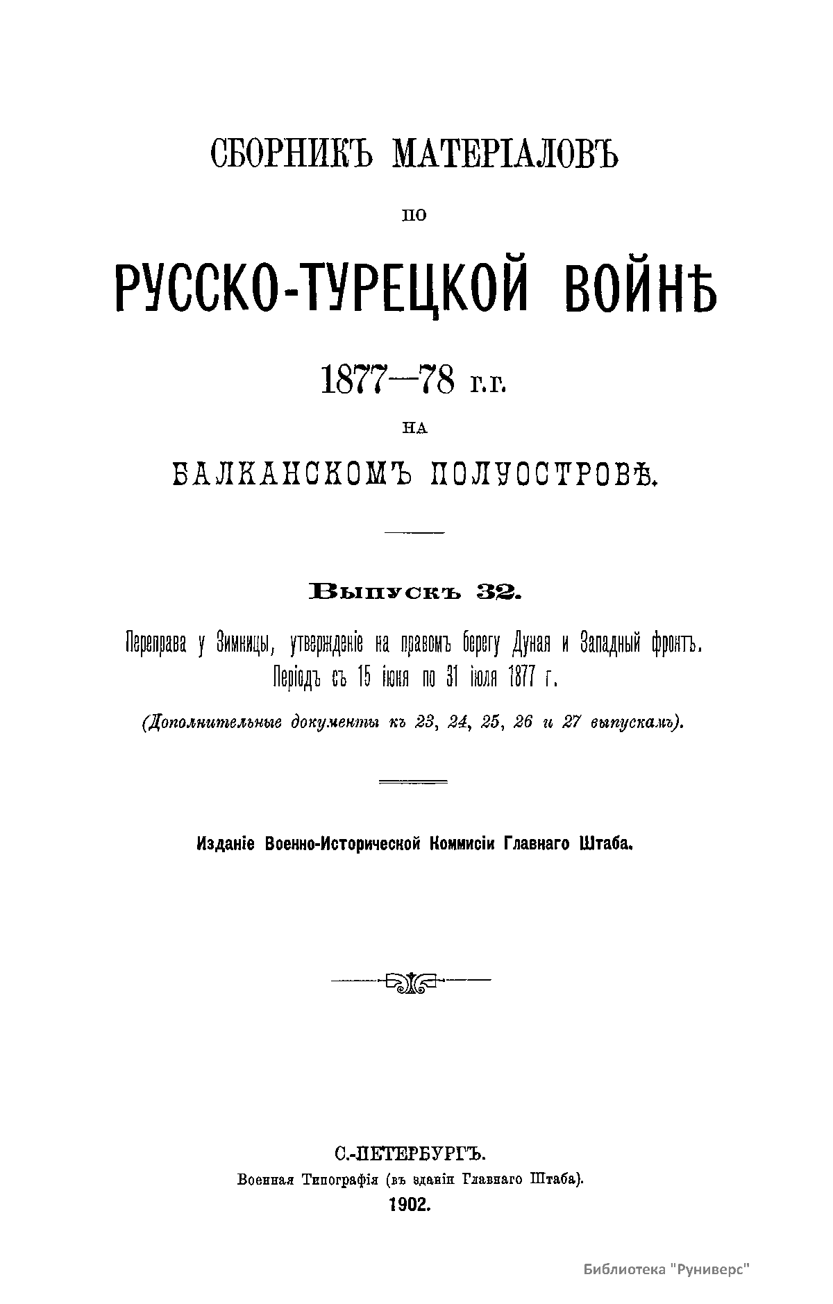 Сборникъ матерiаловъ по русско-турецкой войнѣ 1877-1878 г.г. на Балканскомъ полуостровѣ. Выпускъ 32. Переправа у Зимницы, утвержденiе на правомъ берегу Дуная и Западный фронтъ. Перiод съ 15 iюня по 31 iюня 1877 г. (Дополнительные документы къ 23, 24, 25, 26 и 27 выпускамъ)