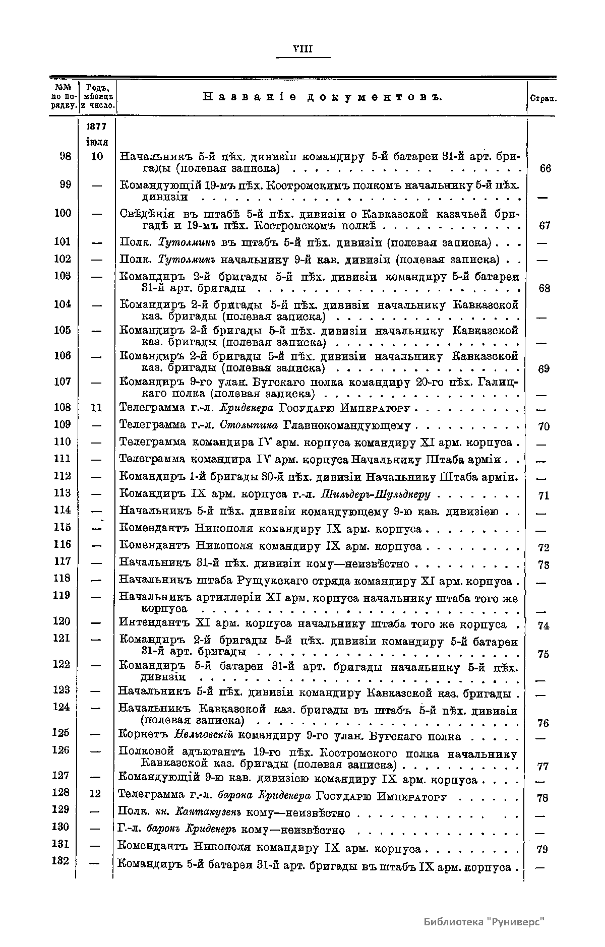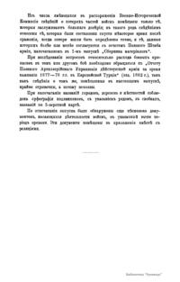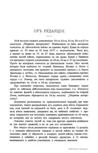 Военно-историческая комиссия Генерального штаба представляет сборник материалов по русско-турецкой войне 1877 – 1878 гг. на Балканском полуострове в 97 выпусках. Издание формирует полное представление о военных действиях и участниках этой войны. Русско-турецкая война 1877 – 1878 гг. была вызвана нежеланием Турции принять меры к улучшению положения подвластных ей христианских княжеств, обусловленному парижским трактатом 1856 г, и стремлением России укрепить свое влияние на Балканах. Способствовала освобождению народов Балканского полуострова от османского владычества. Россия объявила войну Турции 12 апреля 1877 г. Основные события: 1877 – сражение на Шипке, осада и взятие русскими войсками Плевны и Карса; 1878 – зимний переход русской армии через Балканский хребет, победы у Шипки – Шейново, Филиппополя, взятие Адрианополя. Завершилась Сан-Стефанским миром 1878 г., который обеспечил независимость балканским народам и территориальные приобретения России. Но Берлинский трактат ограничил независимость Болгарии и влияние России на Балканах.