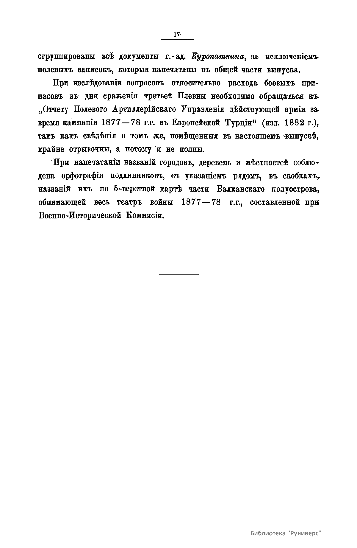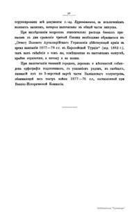 Военно-историческая комиссия Генерального штаба представляет сборник материалов по русско-турецкой войне 1877 – 1878 гг. на Балканском полуострове в 97 выпусках. Издание формирует полное представление о военных действиях и участниках этой войны. Русско-турецкая война 1877 – 1878 гг. была вызвана нежеланием Турции принять меры к улучшению положения подвластных ей христианских княжеств, обусловленному парижским трактатом 1856 г, и стремлением России укрепить свое влияние на Балканах. Способствовала освобождению народов Балканского полуострова от османского владычества. Россия объявила войну Турции 12 апреля 1877 г. Основные события: 1877 – сражение на Шипке, осада и взятие русскими войсками Плевны и Карса; 1878 – зимний переход русской армии через Балканский хребет, победы у Шипки – Шейново, Филиппополя, взятие Адрианополя. Завершилась Сан-Стефанским миром 1878 г., который обеспечил независимость балканским народам и территориальные приобретения России. Но Берлинский трактат ограничил независимость Болгарии и влияние России на Балканах.