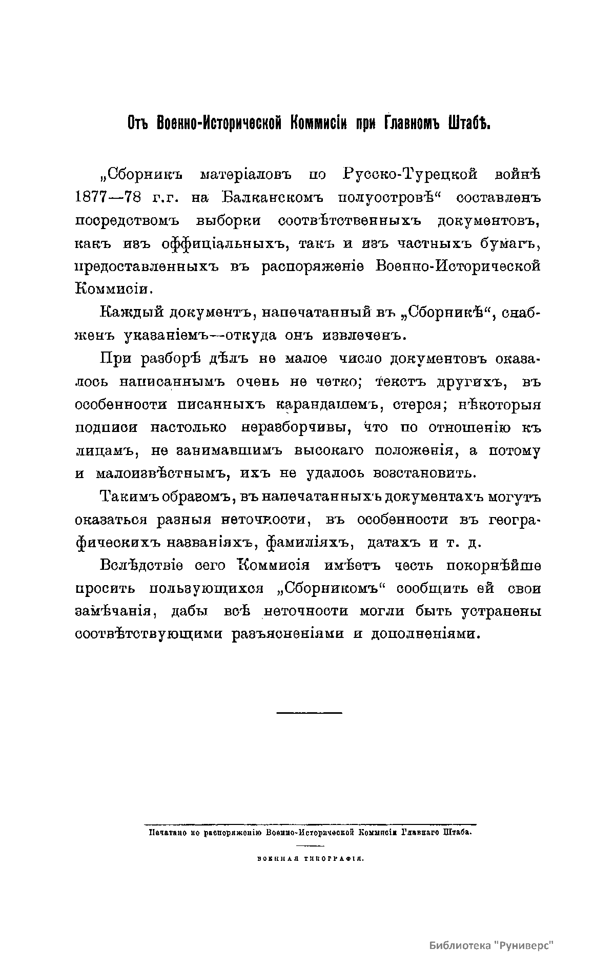 Военно-историческая комиссия Генерального штаба представляет сборник материалов по русско-турецкой войне 1877 – 1878 гг. на Балканском полуострове в 97 выпусках. Издание формирует полное представление о военных действиях и участниках этой войны. Русско-турецкая война 1877 – 1878 гг. была вызвана нежеланием Турции принять меры к улучшению положения подвластных ей христианских княжеств, обусловленному парижским трактатом 1856 г, и стремлением России укрепить свое влияние на Балканах. Способствовала освобождению народов Балканского полуострова от османского владычества. Россия объявила войну Турции 12 апреля 1877 г. Основные события: 1877 – сражение на Шипке, осада и взятие русскими войсками Плевны и Карса; 1878 – зимний переход русской армии через Балканский хребет, победы у Шипки – Шейново, Филиппополя, взятие Адрианополя. Завершилась Сан-Стефанским миром 1878 г., который обеспечил независимость балканским народам и территориальные приобретения России. Но Берлинский трактат ограничил независимость Болгарии и влияние России на Балканах.