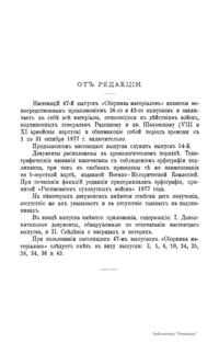 Военно-историческая комиссия Генерального штаба представляет сборник материалов по русско-турецкой войне 1877 – 1878 гг. на Балканском полуострове в 97 выпусках. Издание формирует полное представление о военных действиях и участниках этой войны. Русско-турецкая война 1877 – 1878 гг. была вызвана нежеланием Турции принять меры к улучшению положения подвластных ей христианских княжеств, обусловленному парижским трактатом 1856 г, и стремлением России укрепить свое влияние на Балканах. Способствовала освобождению народов Балканского полуострова от османского владычества. Россия объявила войну Турции 12 апреля 1877 г. Основные события: 1877 – сражение на Шипке, осада и взятие русскими войсками Плевны и Карса; 1878 – зимний переход русской армии через Балканский хребет, победы у Шипки – Шейново, Филиппополя, взятие Адрианополя. Завершилась Сан-Стефанским миром 1878 г., который обеспечил независимость балканским народам и территориальные приобретения России. Но Берлинский трактат ограничил независимость Болгарии и влияние России на Балканах.