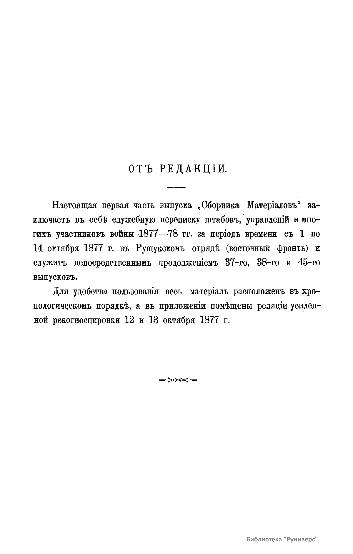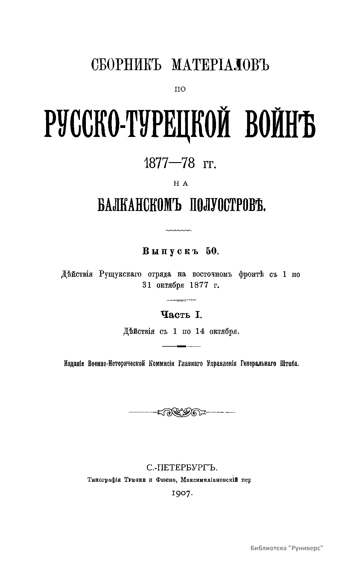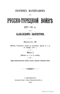 Сборникъ матерiаловъ по русско-турецкой войнѣ 1877-1878 г.г. на Балканскомъ полуостровѣ. Выпускъ 50. Дѣйствiя Рущукскаго отряда на восточномъ фронтѣ съ 1 по 31 октября 1877 г. Часть I. Дѣйствiя съ 1 по 14 октября