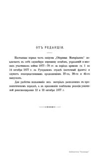 Военно-историческая комиссия Генерального штаба представляет сборник материалов по русско-турецкой войне 1877 – 1878 гг. на Балканском полуострове в 97 выпусках. Издание формирует полное представление о военных действиях и участниках этой войны. Русско-турецкая война 1877 – 1878 гг. была вызвана нежеланием Турции принять меры к улучшению положения подвластных ей христианских княжеств, обусловленному парижским трактатом 1856 г, и стремлением России укрепить свое влияние на Балканах. Способствовала освобождению народов Балканского полуострова от османского владычества. Россия объявила войну Турции 12 апреля 1877 г. Основные события: 1877 – сражение на Шипке, осада и взятие русскими войсками Плевны и Карса; 1878 – зимний переход русской армии через Балканский хребет, победы у Шипки – Шейново, Филиппополя, взятие Адрианополя. Завершилась Сан-Стефанским миром 1878 г., который обеспечил независимость балканским народам и территориальные приобретения России. Но Берлинский трактат ограничил независимость Болгарии и влияние России на Балканах.