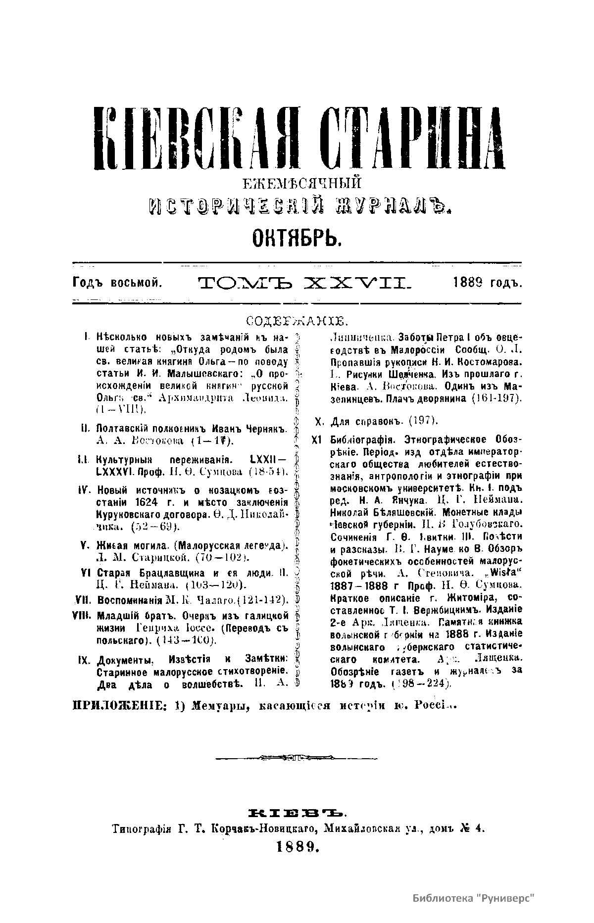 Кiевская старина. Годъ восьмой. Томъ XXVII. Октябрь-Декабрь 1889 г.